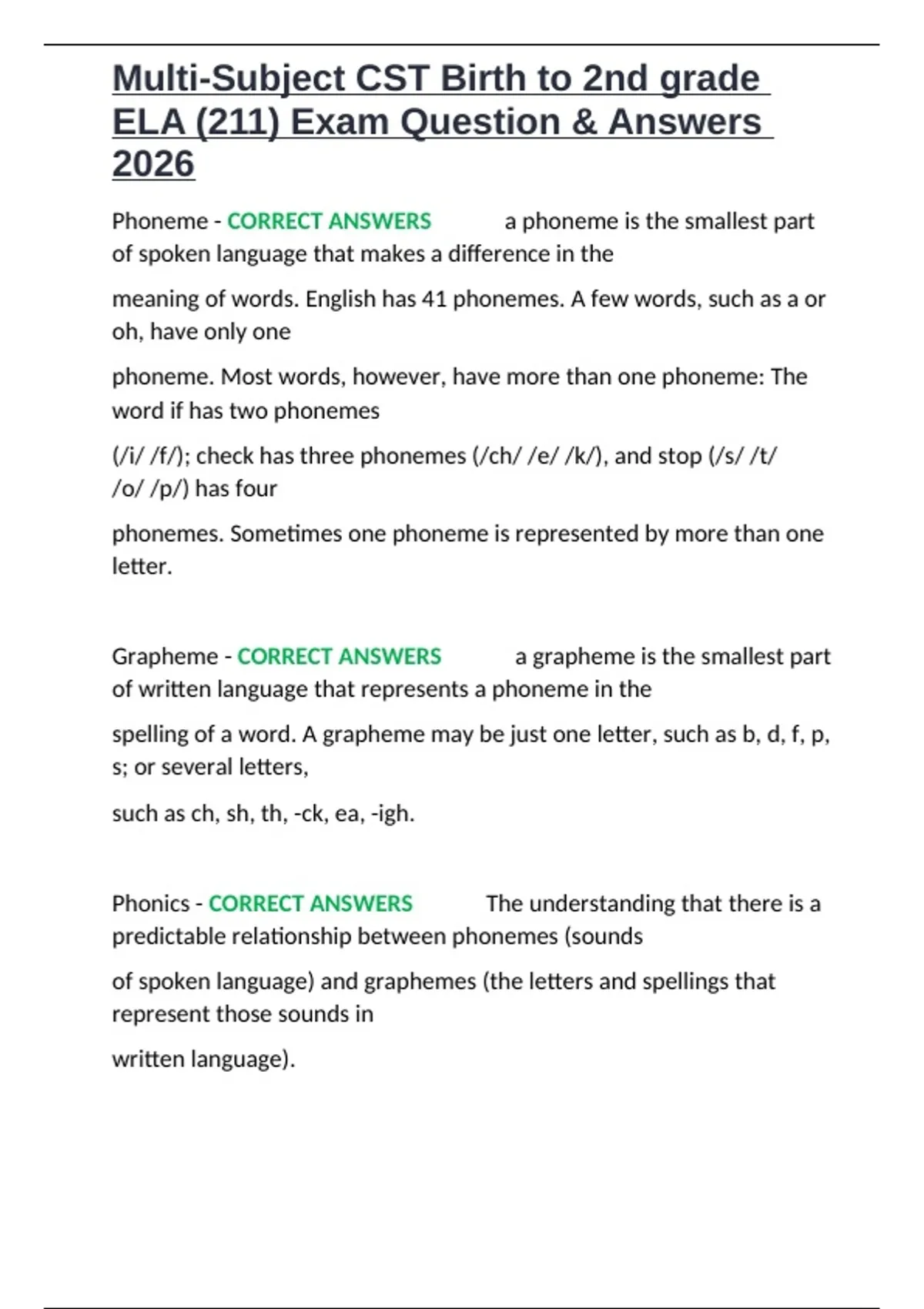 Multi-Subject CST Birth to 2nd grade ELA (211) Exam Question & Answers 2026.docx