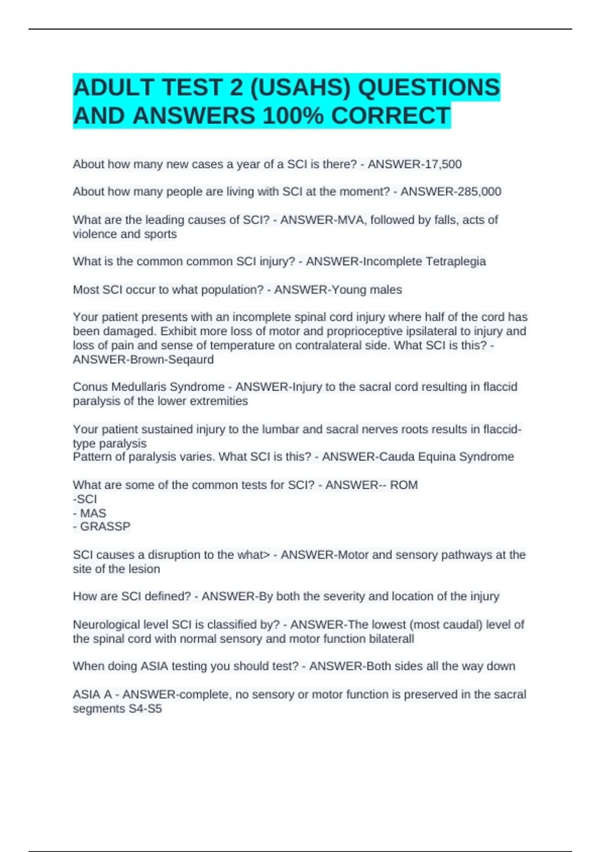 ADULT TEST 2 (USAHS) QUESTIONS AND ANSWERS 100% CORRECTADULT TEST 2 (USAHS) QUESTIONS AND ANSWERS 100% CORRECTADULT TEST 2 (USAHS) QUESTIONS AND ANSWERS 100% CORRECT About how many new cases a year of a SCI is there? - ANSWER-17,500 About how many people are living with SCI at the moment? - ANSWER-285,000 What are the leading causes of SCI? - ANSWER-MVA, followed by falls, acts of violence and sports What is the common common SCI injury? - ANSWER-Incomplete Tetraplegia