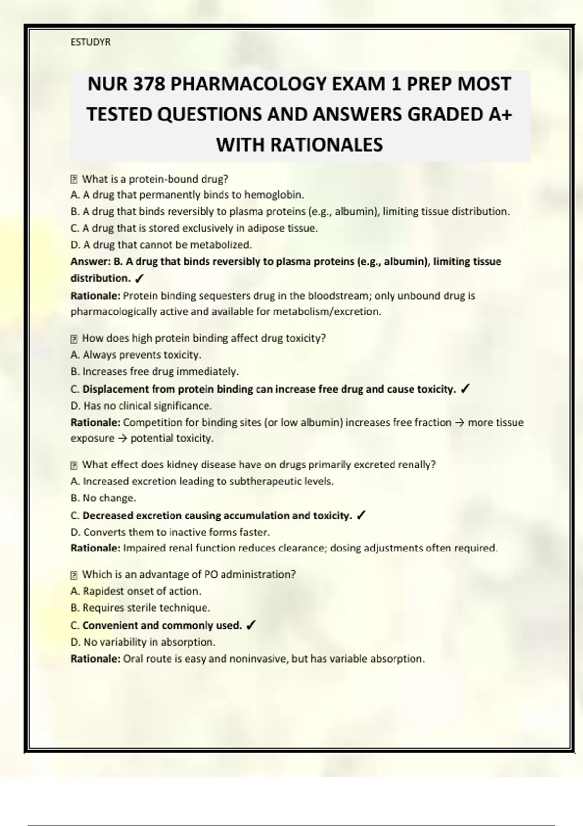 NUR 378 PHARMACOLOGY EXAM 1 PREP MOST TESTED QUESTIONS AND ANSWERS GRADED A+ WITH RATIONALES