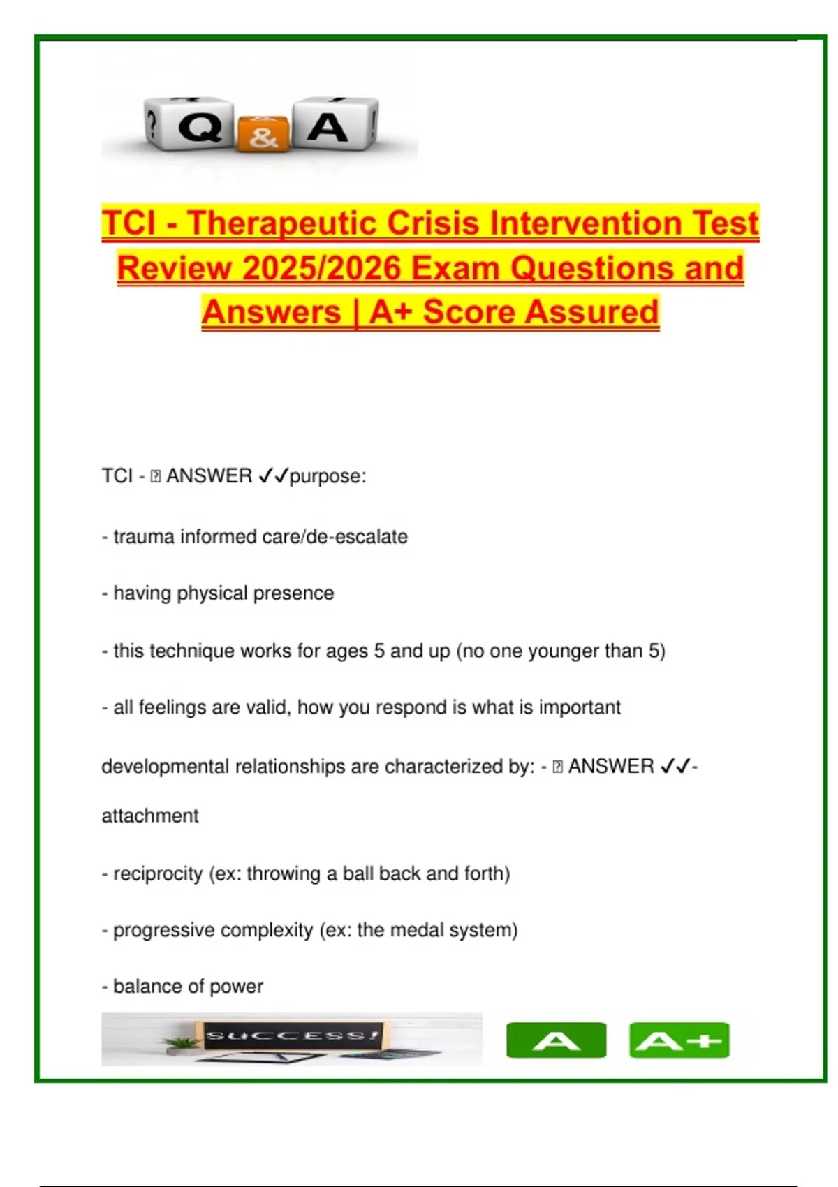 This document contains over 100 detailed exam questions and answers based on the Therapeutic Crisis Intervention (TCI) 2025/2026 certification and training program. Developed in alignment with trauma-informed care practices, it serves as a complete test preparation and review guide, covering theoretical knowledge and applied skills for handling behavioral crises in children and youth. Topics covered include: Foundations of trauma-informed care and developmental relationships The Stress Model of Crisis and behavioral escalation phases Emotional First Aid and co-regulation techniques Life Space Interview (LSI) and post-crisis processing Avoiding power struggles and managing proactive vs reactive aggression Physical intervention safety, positional asphyxia prevention, and documentation ICSP (Individual Crisis Support Plan) implementation and ethical restraint use This document is especially suitable for: Child and Youth Care Workers Social Work and Psychology Students Residential Facility Staff and Juvenile Justice Professionals Mental Health, Behavioral Health, and Special Education Support Personnel Anyone preparing for TCI certification or recertification It is ideal for use in training environments, university coursework, or field-based professional development where therapeutic crisis response and trauma-sensitive practices are emphasized. Keywords: TCI 2025, therapeutic crisis intervention, trauma-informed care, emotional regulation, stress model of crisis, life space interview, co-regulation, child behavior management, physical restraint policy, youth aggression, emotional first aid, ICSP, post-crisis documentation, residential care