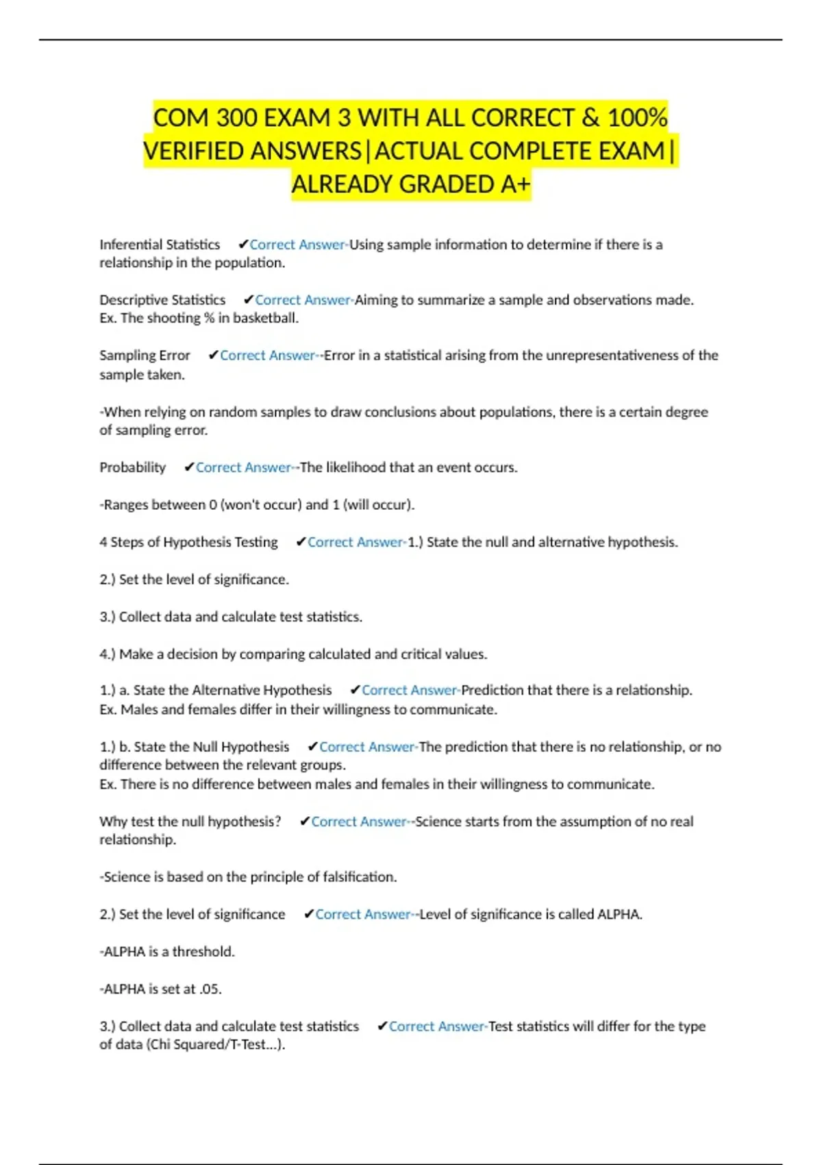 Inferential Statistics ✔Correct Answer-Using sample information to determine if there is a