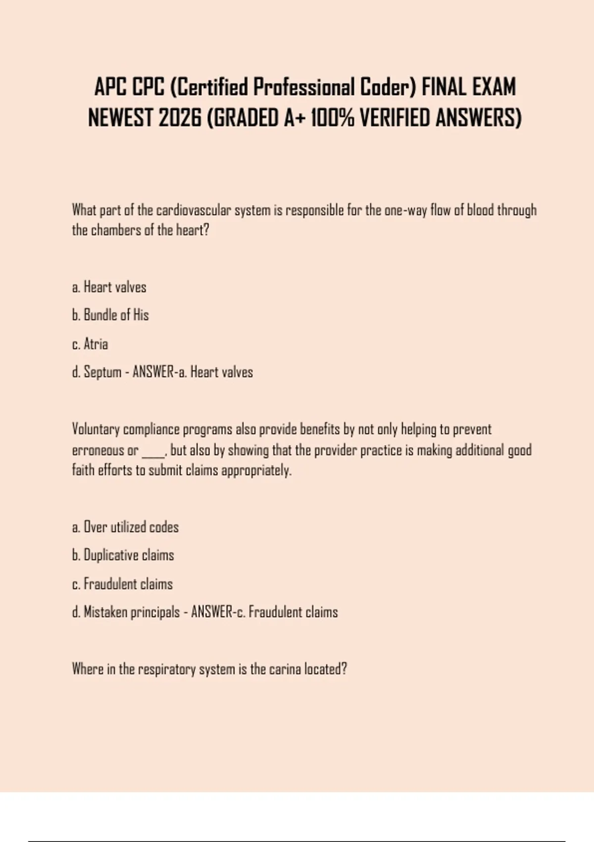 Prepare to ace your APC CPC (Certified Professional Coder) Final Exam 2026 with this newest verified edition, featuring real updated questions, graded A+ answers, and detailed explanations. Ideal for medical coding students and professionals, this 2026 update includes a comprehensive study guide, practice exam, and 100% verified answers — your key to guaranteed CPC certification success./Ace your APC CPC Certified Professional Coder Final Exam 2026 with this newest verified edition, featuring real updated exam questions, graded A+ answers, and full rationales. Perfect for medical coding professionals and students, this 2026 edition includes a comprehensive study guide, practice test, and 100% verified answers to ensure you pass your AAPC CPC certification on the first try.
