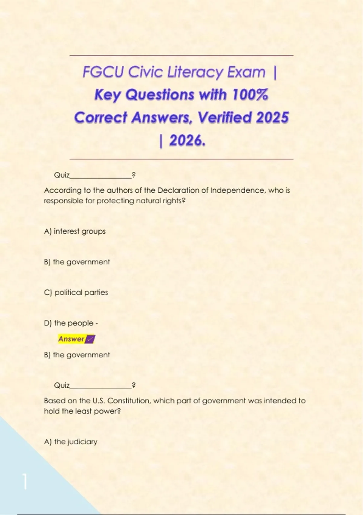 FGCU Civic Literacy Exam | Key Questions with 100% Correct Answers, Verified 2025 | 2026.