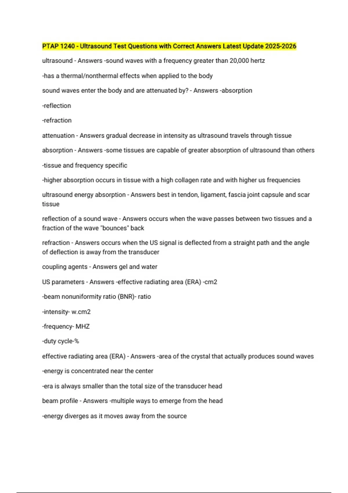 PTAP 1240 - Ultrasound Test Questions with Correct Answers Latest Update ultrasound - Answers -sound waves with a frequency greater than 20,000 hertz -has a thermal/nonthermal effects when applied to the body sound waves enter the body and are attenuated by? - Answers -absorption -reflection -refraction attenuation - Answers gradual decrease in intensity as ultrasound travels through tissue absorption - Answers -some tissues are capable of greater absorption of ultrasound than others -tissue and frequency specific -higher absorption occurs in tissue with a high collagen rate and with higher us frequencies ultrasound energy absorption - Answers best in tendon, ligament, fascia joint capsule and scar tissue reflection of a sound wave - Answers occurs when the wave passes between two tissues and a fraction of the wave "bounces" back refraction - Answers occurs when the US signal is deflected from a straight path and the angle of deflection is away from the transducer coupling agents - Answers gel and water US parameters - Answers -effective radiating area (ERA) -cm2 -beam nonuniformity ratio (BNR)- ratio -intensity- 2 -frequency- MHZ -duty cycle-% effective radiating area (ERA) - Answers -area of the crystal that actually produces sound waves -energy is concentrated near the center -era is always smaller than the total size of the transducer head beam profile - Answers -multiple ways to emerge from the head -energy diverges as it moves away from the source -energy is uniform close to the head (fresnel zone) -becomes less consistent farther away from the head (spatial peak intensity) beam nonuniformity ration (BNR) - Answers -describes amount of variation in the beam -perfect beam would have a BNR of 1:1 ration is between the spatial peak intensity and spatial averaged intensity -high the quality of the crystal, the lower the BMR -lower BNR is more favorable since patients will be less likely to experience hot spots and discomfort during treatment frequency - Answers -selected according to the depth of the tissue to be treated -US delivered at a higher frequency is absorbed more rapidly than US delivered at a lower frequency 3 MHZ - Answers reaches soft tissues 1-2 cm deep 1 MHZ - Answers reaches soft tissues up to 5 cm deep intensity - Answers -measures the quantity of energy delivered per unit area -spatial average intensity: the average intensity of the US input over the area of the transducer; expressed in w/cm2 -selected according to treatment goal -3 MHZ increases tissue temp ~3x faster than 1 MHZ when same duty cycle - Answers portion of treatment time that US is generated during the entire treatment continuous - Answers uninterrupted flow of sound waves; intensity remains constant; 100% used when the goal is to increase tissue temp pulsed - Answers produced by intermittently interrupting the supply of electrical energy to the US head, which causes the sound waves to be discontinuous; 20% most recommended pulsed cycle; used when nonthermal effects desired thermal effects - Answers -increase extensibility of collagen structures -decrease joint stiffness and inflammation -pain relief -increase blood flow -decrease muscle spasms -increased metabolic rate -enhanced immune system response -decreased viscosity of tissue fluids continuous US - Answers -sound waves consist of compression and rarefaction which oscillates particles of material; increases in molecular vibration in the tissue can result in the heat generation -extent of thermal effects is dependent on the intensity, duration and frequency selected