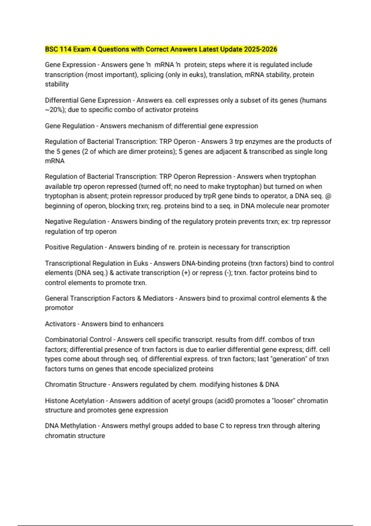 BSC 114 Exam 4 Questions with Correct Answers Latest Update Gene Expression - Answers gene → mRNA → protein; steps where it is regulated include transcription (most important), splicing (only in euks), translation, mRNA stability, protein stability Differential Gene Expression - Answers ea. cell expresses only a subset of its genes (humans ~20%); due to specific combo of activator proteins Gene Regulation - Answers mechanism of differential gene expression Regulation of Bacterial Transcription: TRP Operon - Answers 3 trp enzymes are the products of the 5 genes (2 of which are dimer proteins); 5 genes are adjacent & transcribed as single long mRNA Regulation of Bacterial Transcription: TRP Operon Repression - Answers when tryptophan available trp operon repressed (turned off; no need to make tryptophan) but turned on when tryptophan is absent; protein repressor produced by trpR gene binds to operator, a DNA seq. @ beginning of operon, blocking trxn; reg. proteins bind to a seq. in DNA molecule near promoter Negative Regulation - Answers binding of the regulatory protein prevents trxn; ex: trp repressor regulation of trp operon Positive Regulation - Answers binding of re. protein is necessary for transcription Transcriptional Regulation in Euks - Answers DNA-binding proteins (trxn factors) bind to control elements (DNA seq.) & activate transcription (+) or repress (-); trxn. factor proteins bind to control elements to promote trxn. General Transcription Factors & Mediators - Answers bind to proximal control elements & the promotor Activators - Answers bind to enhancers Combinatorial Control - Answers cell specific transcript. results from diff. combos of trxn factors; differential presence of trxn factors is due to earlier differential gene express; diff. cell types come about through seq. of differential express. of trxn factors; last "generation" of trxn factors turns on genes that encode specialized proteins Chromatin Structure - Answers regulated by chem. modifying histones & DNA Histone Acetylation - Answers addition of acetyl groups (acid0 promotes a "looser" chromatin structure and promotes gene expression DNA Methylation - Answers methyl groups added to base C to repress trxn through altering chromatin structure Epigenetic Inheritance - Answers modifications & patterns of gene expression are passed down @ cell division to descendent cells Promoter - Answers proximal/close to gene being expressed control elements Enhancer - Answers distal/far from gene being expressed control elements; proteins bound to this make contact w/ & stimulate RNA polymerase via looping of intervening DNA Alternative Splicing - Answers primary transcript may be spliced in diff. ways Small RNAs may regulate mRNA stability & translation - Answers miRNA: micro RNAs that do not code for protein seq. but bind to target mRNA to induce mRNA degradation or translation inhibition siRNA: short interfering RNAs that do not code for protein seq. Both are 20-23 nt RNA molecules Differentiation - Answers cellular specialization; cell acquires its final specialized form Determination - Answers cells acquire info & become committed to a particular fate in the organism; under genetic control; precedes differentiation Pattern Formation - Answers spatial control of gene expression, determination & differentiation; diff. patterns arise b/c regulatory molecules are distributed asymmetrically Asymmetric Regulatory Molecules - Answers ~unequal cytokinesis & diff. cytoplasmic contents (molecules = cytoplasmic determinants) ~different extracellular signals (process = induction) Homeotic Genes - Answers "master genes" that control cellular identity; regulate the anterior-posterior development of all bilateral animals; these proteins are trxn factors Cancer - Answers disease of unregulated cell proliferation; loss of inhibition of proliferation; loss of cell adhesion (ability to leave tumor & move elsewhere); ability to stimulate vascularization Cancer & Genetic Control - Answers Cell proliferation is genetically controlled signaling processes... neighboring cells may stimulate or inhibit cell division And regulations of trxn... entry into mitosis involves adoption of an internal genetic program Proto-oncogenes - Answers encode proteins that promote cell division Tumor-suppressor Genes - Answers encode proteins that repress cell division Oncogenes - Answers mutant version of proto-oncogenes; mutant proteins promote cell division, but lack the ability to be regulated; only takes one mutant allele to promote cancer in a dom. manner Mutant Tumor-suppressor Genes - Answers encode defective proteins that do not repress cell division; recessive, both genes must be mutant for cancer progression Positive Regulators of Proliferation & Cancer - Answers mutations can cause protein to get stuck in the "on" position; resulting in inappropriate cell proliferation; ex:) oncogene Negative Regulators or Proliferation & Cancer - Answers mutation alleles produce a non-functional protein that fails to act; ex:) tumor-suppressor genes