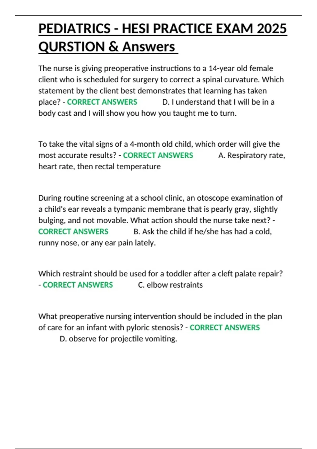 PEDIATRICS - HESI PRACTICE EXAM 2025 QURSTION & Answers.docx