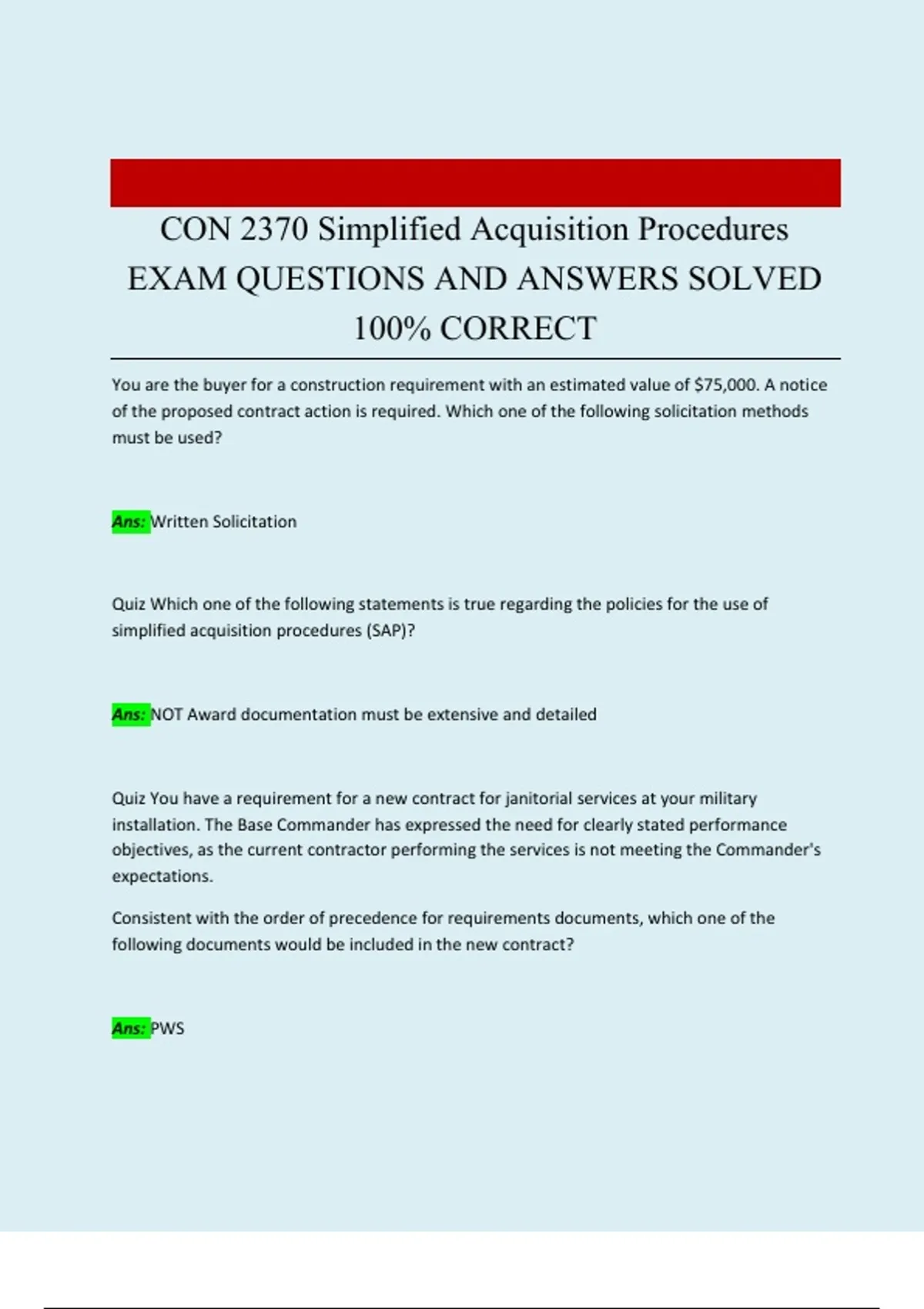 CON 2370 Simplified Acquisition Procedures EXAM QUESTIONS AND ANSWERS SOLVED 100% CORRECT