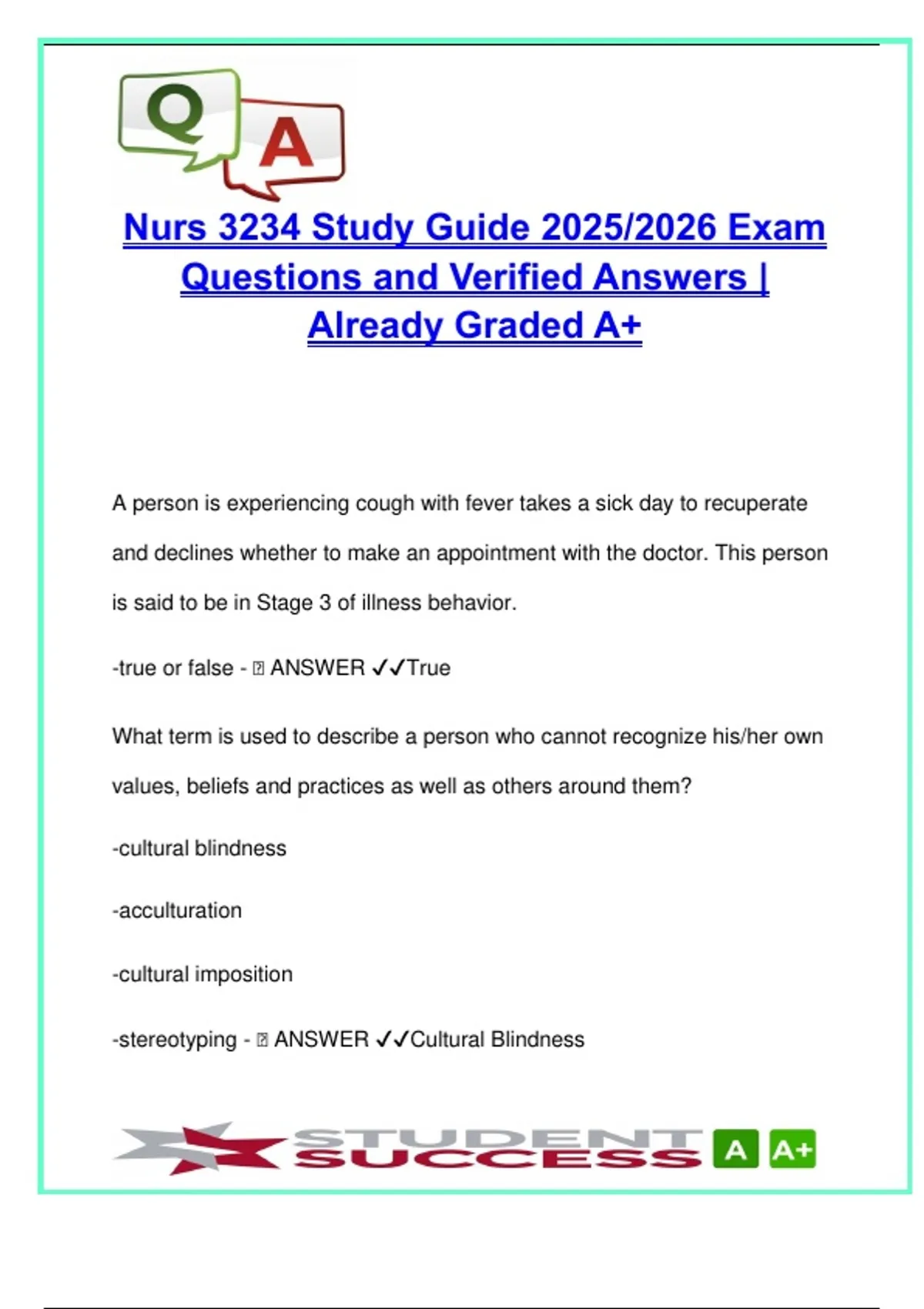 This detailed study guide contains 90 verified Q&A based on the 2025/2026 curriculum for NURS 3234, designed to prepare nursing students for upcoming exams and clinical evaluations. The questions follow a high-yield format that integrates nursing theory, clinical decision-making, ethical standards, patient-centered care, and safety protocols, offering concise yet deep insight into key nursing principles. The content is grounded in realistic nursing scenarios, helping students strengthen their understanding of: Illness behavior stages and health promotion strategies Ethical and legal responsibilities, including confidentiality, nonmaleficence, and professional accountability Cultural competence and patient-centered communication techniques Maslow’s hierarchy of needs, therapeutic interventions, and psychosocial care Documentation, safety protocols (PPE, injection sites), and patient identification Patient advocacy, nurse-patient interaction, and holistic nursing care Preventive healthcare levels (primary, secondary, tertiary) Nursing process and clinical reasoning development Each question is matched with its correct answer and contextual explanation when relevant, making this guide ideal for solo study, group revision, or tutoring sessions. Recommended for: BSN, RN-to-BSN, and accelerated nursing students Those enrolled in Nursing Fundamentals, Intro to Professional Nursing, or Nursing Ethics Students preparing for NCLEX-RN, ATI, or program-level exams Learners aiming to improve critical thinking and patient interaction skills This resource is also valuable for pre-licensure students working to bridge theory and practice in both academic and clinical environments. Keywords: NURS 3234, study guide nursing, nursing ethics, illness stages, Maslow hierarchy, nursing exam questions, patient care, documentation, confidentiality, cultural competence, PPE, safety protocols, NCLEX prep, nursing process, tertiary prevention, nurse-patient communication, critical thinking, legal nursing standards, BSN review