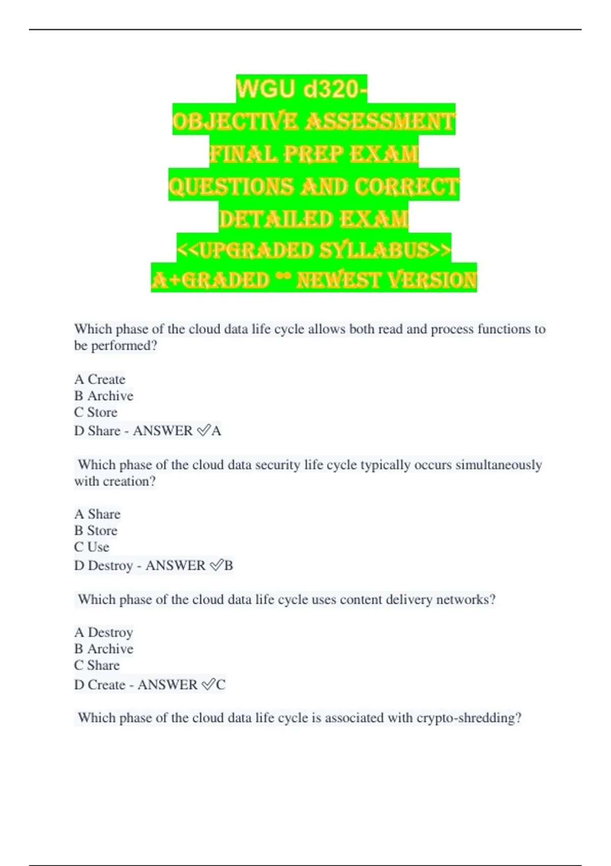 WGU d320- Objective assessment Final prep exam Questions and correct Detailed answers upgraded syllabus A+graded ** newest version Which phase of the cloud data life cycle allows both read and process functions to be performed? A Create B Archive C Store D Share - ANSWER A Which phase of the cloud data security life cycle typically occurs simultaneously with creation? A Share B Store C Use D Destroy - ANSWER B Which phase of the cloud data life cycle uses content delivery networks? A Destroy B Archive C Share D Create - ANSWER C Which phase of the cloud data life cycle is associated with crypto-shredding? A Share B Use C Destroy D Store - ANSWER C Which cloud data storage architecture allows sensitive data to be replaced with unique identification symbols that retain all the essential information about the data without compromising its security? A Randomization B Obfuscation C Anonymization D Tokenization - ANSWER D Which methodology could cloud data storage utilize to encrypt all data associated in an infrastructure as a service (IaaS) deployment model? A Sandbox encryption B Polymorphic encryption C Client-side encryption D Whole-instance encryption - ANSWER D There is a threat to a banking cloud platform service. The developer needs to provide inclusion in a relational database that is seamless and readily searchable by search engine algorithms. Which platform as a service (PaaS) data type should be used? A Short-term storage B Structured C Unstructured D Long-term storage - ANSWER B Which platform as a service (PaaS) storage architecture should be used if an organization wants to store presentations, documents, and audio files? A Relational database B Block C Distributed D Object - ANSWER D Which technique scrambles the content of data using a mathematical algorithm while keeping the structural arrangement of the data? A Dynamic masking B Format-preserving encryption C Proxy-based encryption D Tokenization - ANSWER B Which encryption technique connects the instance to the encryption instance that handles all crypto operations? A Database B Proxy C Externally managed D Server-side - ANSWER B Which type of control should be used to implement custom controls that safeguard data? A Public and internal sharing B Options for access C Management plane D Application level - ANSWER D Which element is protected by an encryption system? A Ciphertext B Management engine C Data D Public key - ANSWER C A cloud administrator recommends using tokenization as an alternative to protecting data without encryption. The administrator needs to make an authorized application request to access the data. Which step should occur immediately before this action is taken? A The tokenization server returns the token to the application. B The tokenization server generates the token. C The application collects a token. D The application stores the token. - ANSWER D A company has recently defined classification levels for its data. During which phase of the cloud data life cycle should this definition occur? A Use B Create C Share D Archive - ANSWER B