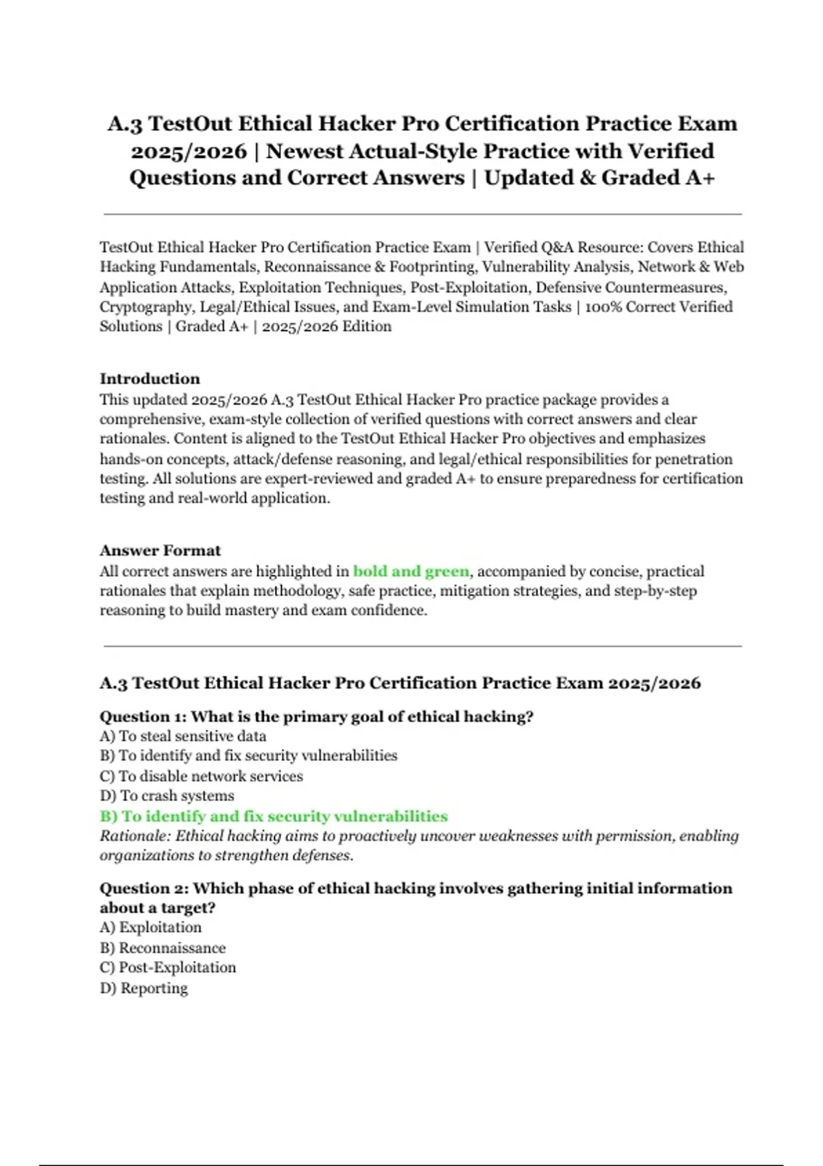 TestOut Ethical Hacker Pro Certification Practice Exam | Verified Q&A Resource: Covers Ethical