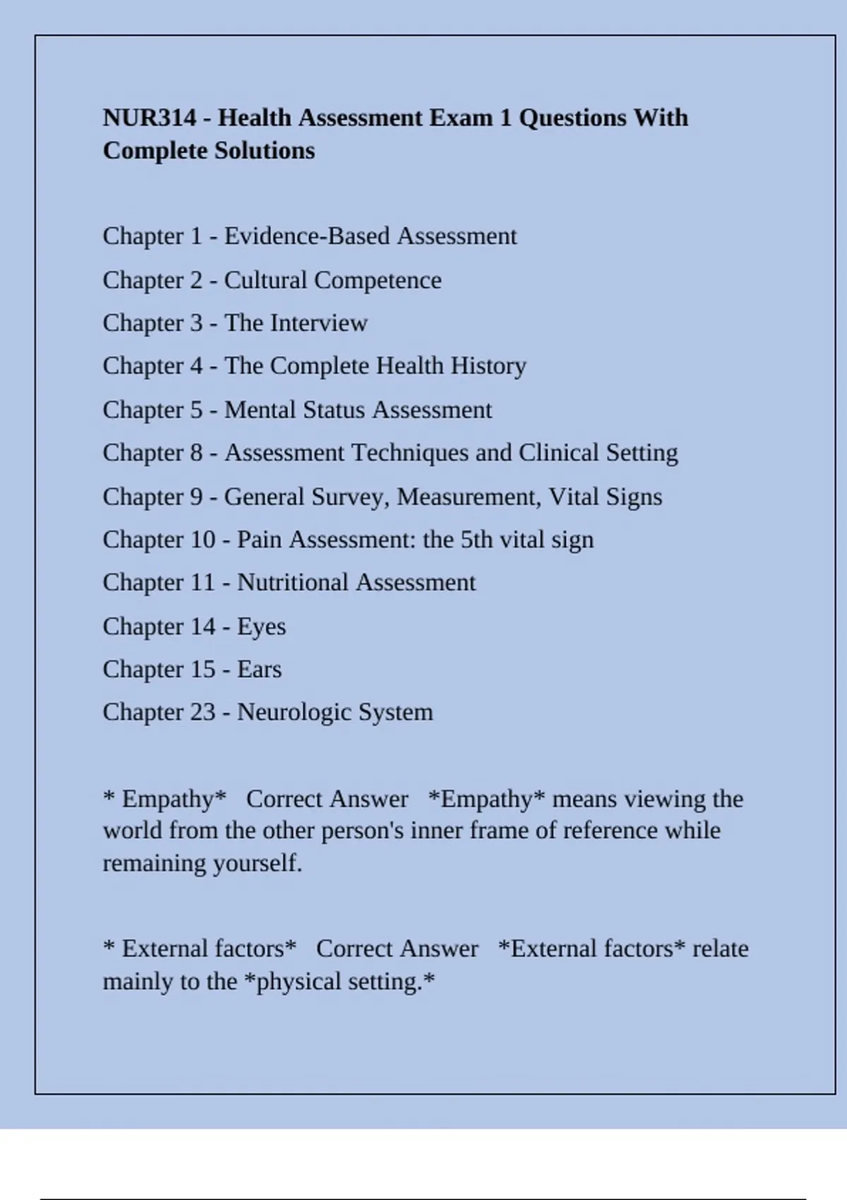 NUR314 - Health Assessment Exam 1 Questions With Complete Solutions