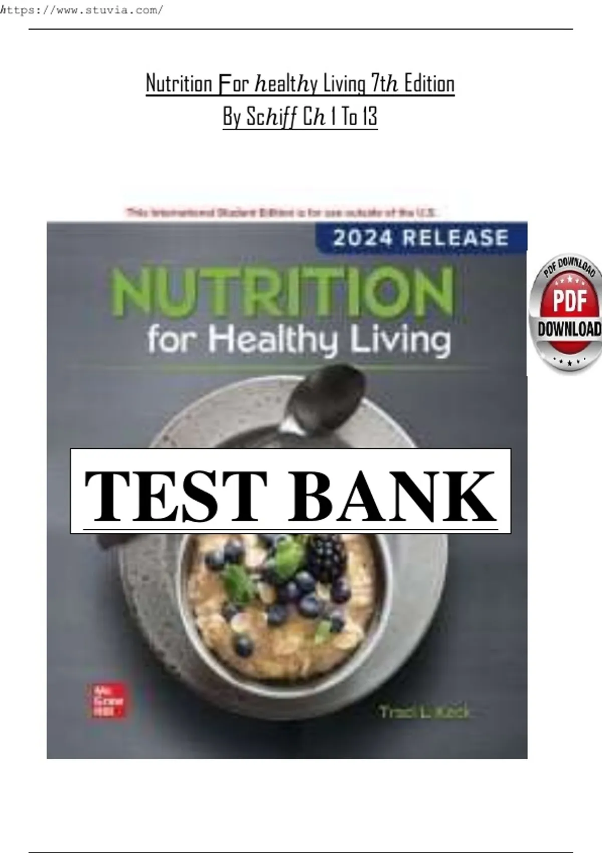 This full test bank covers Chapters 1 through 13 of Nutrition for Healthy Living (7th Edition). It features multiple-choice, true/false, and short-answer questions with verified answers. Designed for students in NUTR 110 – Foundations of Nutrition, it offers comprehensive practice on basic nutritional concepts, macronutrients, micronutrients, energy balance, diet planning, and public health applications. nutrition for healthy living, nutrition test bank, NUTR110, nutrition practice questions, macronutrients, micronutrients, diet planning, energy balance, nutrition review, exam prep