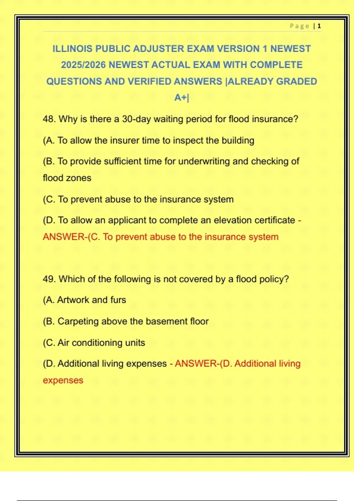 ILLINOIS PUBLIC ADJUSTER EXAM VERSION 1 NEWEST