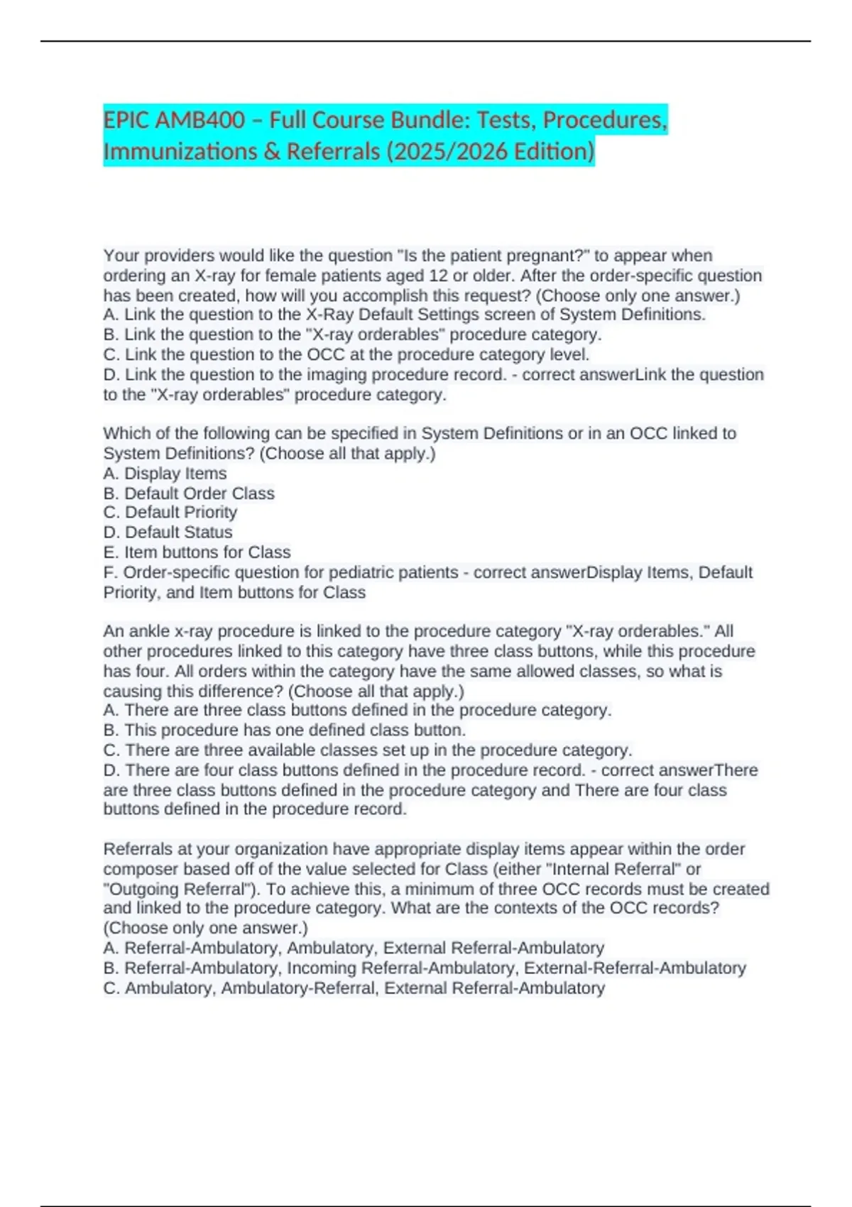 Ace your EPIC AMB400 certification with this comprehensive 2025/2026 course bundle! This verified collection includes detailed study notes, practice questions, and accurate answers covering tests, procedures, immunizations, referrals, and workflow management within EpicCare Ambulatory. Perfect for EpicCare trainees, analysts, and administrators, this bundle provides real-world examples and step-by-step explanations to help you master: Patient & provider workflow setup Immunization and procedure configuration Test and referral documentation Chart review & order processing Reporting and system optimization Ideal for quick review, certification prep, or on-the-job reference. Includes: Verified 2025/2026 content Correct answers & rationales Organized by topic Covers latest EpicCare AMB400 updates