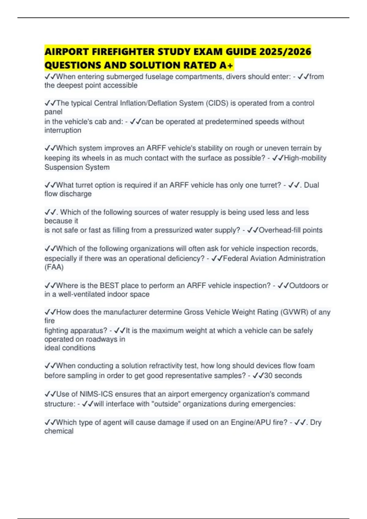 AIRPORT FIREFIGHTER STUDY EXAM GUIDE 2025/2026 QUESTIONS AND SOLUTION RATED A+