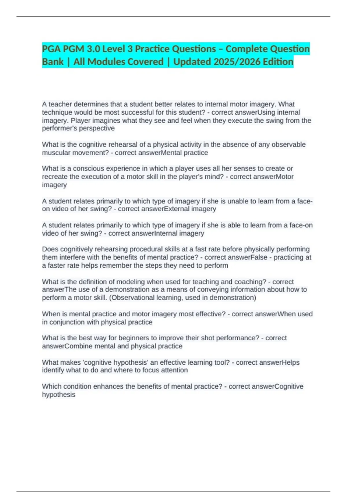 Master your PGA PGM 3.0 Level 3 exams with this complete question bank, fully updated for 2025/2026! Includes hundreds of verified practice questions and correct answers covering all key modules — Operations, Golf Car Fleet Management, Business Planning, Food & Beverage, and Player Development. Perfect for PGA professionals and trainees preparing for Level 3 certification. Comprehensive & organized by topic Realistic exam-style questions 100% verified and up-to-date Get fully prepared and pass your PGA Level 3 with confidence! ️‍♂️