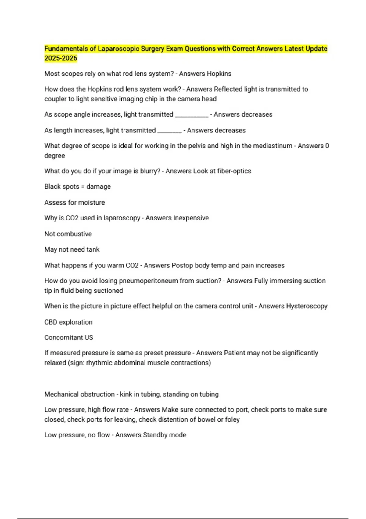 Fundamentals of Laparoscopic Surgery Exam Questions with Correct Answers Latest Update Most scopes rely on what rod lens system? - Answers Hopkins How does the Hopkins rod lens system work? - Answers Reflected light is transmitted to coupler to light sensitive imaging chip in the camera head As scope angle increases, light transmitted ___________ - Answers decreases As length increases, light transmitted ________ - Answers decreases What degree of scope is ideal for working in the pelvis and high in the mediastinum - Answers 0 degree What do you do if your image is blurry? - Answers Look at fiber-optics Black spots = damage Assess for moisture Why is CO2 used in laparoscopy - Answers Inexpensive Not combustive May not need tank What happens if you warm CO2 - Answers Postop body temp and pain increases How do you avoid losing pneumoperitoneum from suction? - Answers Fully immersing suction tip in fluid being suctioned When is the picture in picture effect helpful on the camera control unit - Answers Hysteroscopy CBD exploration Concomitant US If measured pressure is same as preset pressure - Answers Patient may not be significantly relaxed (sign: rhythmic abdominal muscle contractions) Mechanical obstruction - kink in tubing, standing on tubing Low pressure, high flow rate - Answers Make sure connected to port, check ports to make sure closed, check ports for leaking, check distention of bowel or foley Low pressure, no flow - Answers Standby mode Check gas level Blank monitor - Answers NOT camera fog Check cords Benefits and risks of bipolar current - Answers Current flows through smaller tissue volume - less risk of lateral tissue damage and necrosis Risk of cutting vessels before sealing Improper device function Which current type does not require dispersive electrodes - Answers Bipolar At what temperature does protein denaturation occur? - Answers Over 60 degrees celsius How does coagulation occur with monopolar energy - Answers Bonds are reformed in haphazard manner after heating The tissue turning brown and steamy with monopolar energy is a result of - Answers Desiccation. As desiccation increases, impedance increases until current stops flowing due to high resistance. The amount of current flowing through a cross sectional area of tissue - Answers Current density Current density is _______ proportional to tissue resistance - Answers Inversely The _______ the contact area, the greater the current density and faster heating - Answers smaller What are the three modes of operation for cautery - Answers Cut Coag Blend What is the goal of cut energy - Answers Heat tissue quickly so cell water is converted to steam and the cell explodes Why are you less likely to have lateral thermal damage with cut? - Answers Heat dissipated in steam Cut waveform - Answers Unmodulated Low voltage Fulguration is the result of ________ energy - Answers Coag Rapid surface heating, superficial eschar formation, shallow necrosis depth
