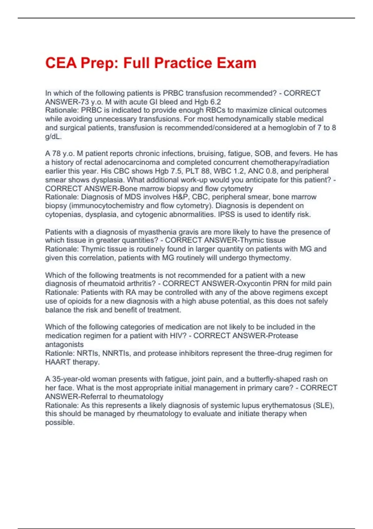 In which of the following patients is PRBC transfusion recommended? - CORRECT ANSWER-73 y.o. M with acute GI bleed and Hgb 6.2 Rationale: PRBC is indicated to provide enough RBCs to maximize clinical outcomes while avoiding unnecessary transfusions. For most hemodynamically stable medical and surgical patients, transfusion is recommended/considered at a hemoglobin of 7 to 8 g/dL. A 78 y.o. M patient reports chronic infections, bruising, fatigue, SOB, and fevers. He has a history of rectal adenocarcinoma and completed concurrent chemotherapy/radiation earlier this year. His CBC shows Hgb 7.5, PLT 88, WBC 1.2, ANC 0.8, and peripheral smear shows dysplasia. What additional work-up would you anticipate for this patient? - CORRECT ANSWER-Bone marrow biopsy and flow cytometry Rationale: Diagnosis of MDS involves H&P, CBC, peripheral smear, bone marrow biopsy (immunocytochemistry and flow cytometry). Diagnosis is dependent on cytopenias, dysplasia, and cytogenic abnormalities. IPSS is used to identify risk. Patients with a diagnosis of myasthenia gravis are more likely to have the presence of which tissue in greater quantities? - CORRECT ANSWER-Thymic tissue Rationale: Thymic tissue is routinely found in larger quantity on patients with MG and given this correlation, patients with MG routinely will undergo thymectomy. Which of the following treatments is not recommended for a patient with a new diagnosis of rheumatoid arthritis? - CORRECT ANSWER-Oxycontin PRN for mild pain Rationale: Patients with RA may be controlled with any of the above regimens except use of opioids for a new diagnosis with a high abuse potential, as this does not safely balance the risk and benefit of treatment. Which of the following categories of medication are not likely to be included in the medication regimen for a patient with HIV? - CORRECT ANSWER-Protease antagonists Rationle: NRTIs, NNRTIs, and protease inhibitors represent the three-drug regimen for HAART therapy. A 35-year-old woman presents with fatigue, joint pain, and a butterfly-shaped rash on her face. What is the most appropriate initial management in primary care? - CORRECT ANSWER-Referral to rheumatology Rationale: As this represents a likely diagnosis of systemic lupus erythematosus (SLE), this should be managed by rheumatology to evaluate and initiate therapy when possible.Which of the following symptoms best describes a classic case of systemic lupus erythematosus? - CORRECT ANSWER-Butterfly rash on the face Rationale: Rash on the back is more common with pityriasis rosea. A large collection of urate crystals in the joint is likely gout. Painful ambulation with joint laxity and ecchymosis suggests ligamentum injury. Butterfly rash on the face is classic SLE. Patients with Stevens-Johnson syndrome should be managed by which of the following mechanisms? - CORRECT ANSWER-Similarly to burn patients due to loss of fluid volume Rationale: Due to the loss of the protective skin barrier where sloughing occurs, infection risk is high and substantial insensible fluid loss means these patients need to be treated as burn victims would be. Hypervolemia is not a typical concern for the same reason, as they tend to be underfilled. Off floor privileges would not be wise since the infection risk and pain requires close monitoring, fall risk,