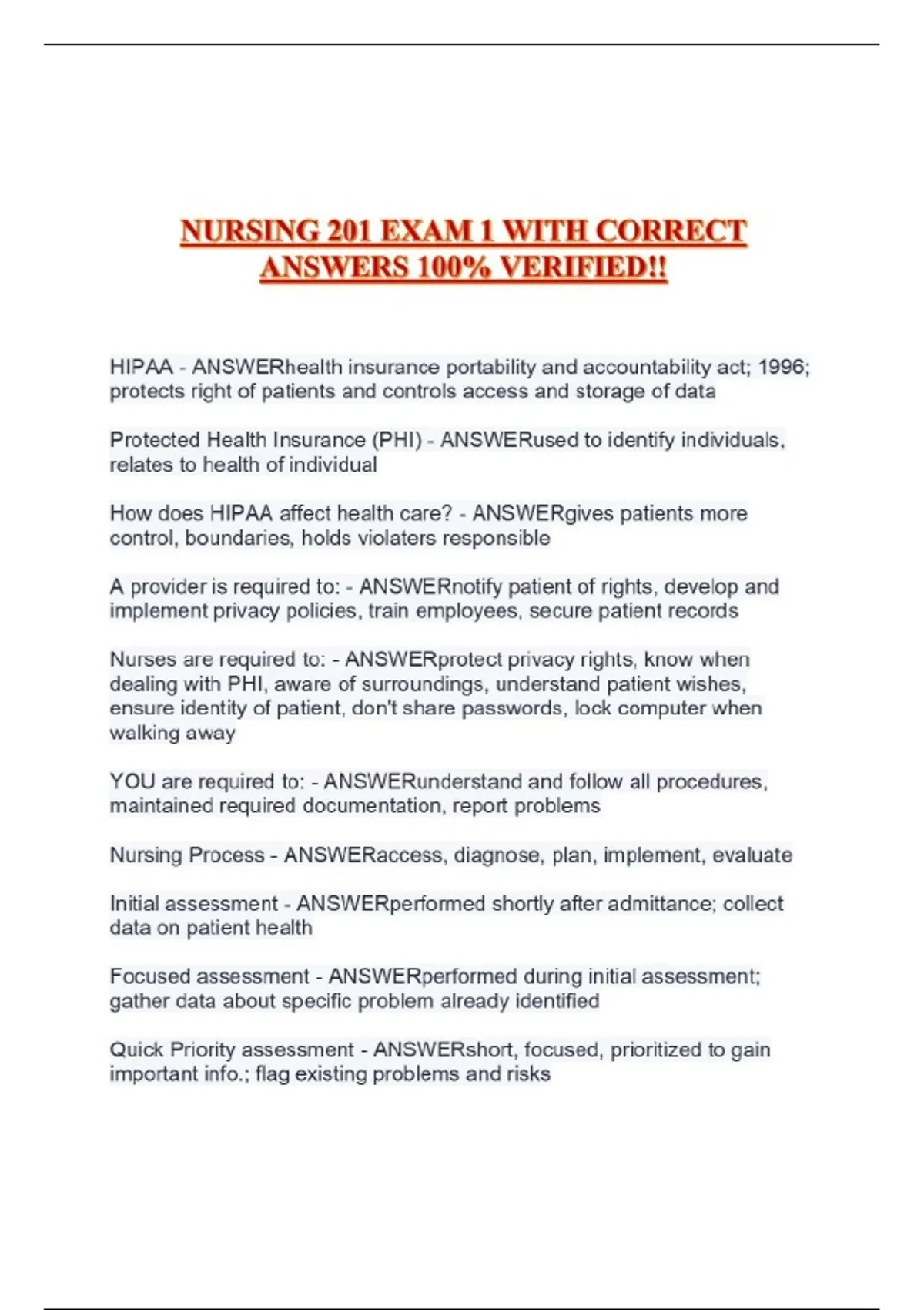 NURSING 201 EXAM 1 WITH CORRECT ANSWERS 100% VERIFIED!!