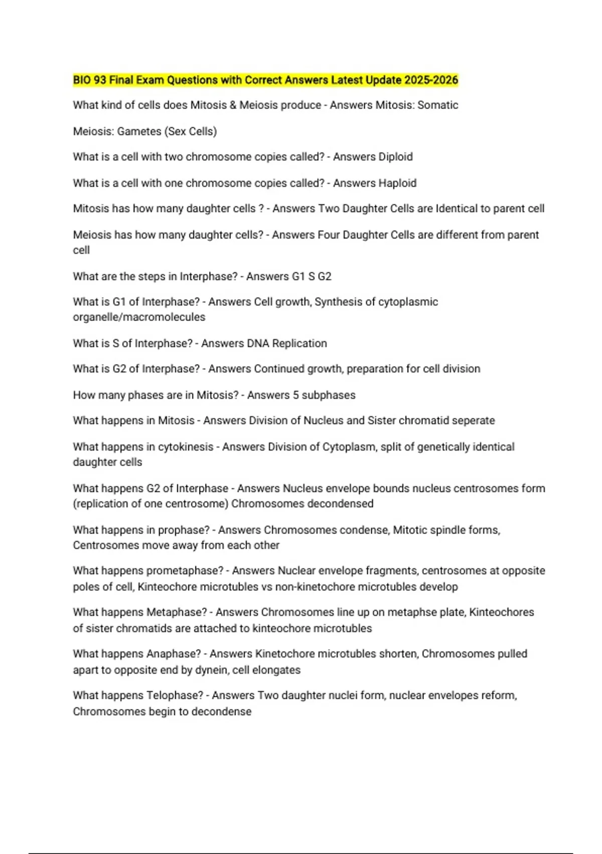 BIO 93 Final Exam Questions with Correct Answers Latest Update 2025-2026