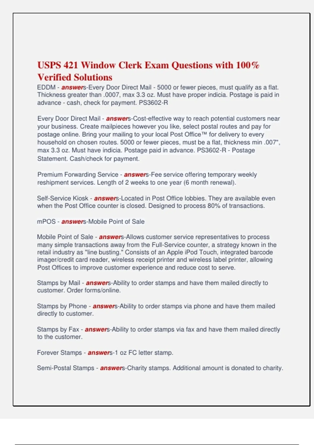 USPS 421 Window Clerk Exam Questions with 100% Verified Solutions EDDM - answers-Every Door Direct Mail - 5000 or fewer pieces, must qualify as a flat. Thickness greater than .0007, max 3.3 oz. Must have proper indicia. Postage is paid in advance - cash, check for payment. PS3602-R Every Door Direct Mail - answers-Cost-effective way to reach potential customers near your business. Create mailpieces however you like, select postal routes and pay for postage online. Bring your mailing to your local Post Office™ for delivery to every household on chosen routes. 5000 or fewer pieces, must be a flat, thickness min .007", max 3.3 oz. Must have indicia. Postage paid in advance. PS3602-R - Postage Statement. Cash/check for payment. Premium Forwarding Service - answers-Fee service offering temporary weekly reshipment services. Length of 2 weeks to one year (6 month renewal). Self-Service Kiosk - answers-Located in Post Office lobbies. They are available even when the Post Office counter is closed. Designed to process 80% of transactions. mPOS - answers-Mobile Point of Sale Mobile Point of Sale - answers-Allows customer service representatives to process many simple transactions away from the Full-Service counter, a strategy known in the retail industry as "line busting." Consists of an Apple iPod Touch, integrated barcode imager/credit card reader, wireless receipt printer and wireless label printer, allowing Post Offices to improve customer experience and reduce cost to serve. Stamps by Mail - answers-Ability to order stamps and have them mailed directly to customer. Order forms/online. Stamps by Phone - answers-Ability to order stamps via phone and have them mailed directly to customer. Stamps by Fax - answers-Ability to order stamps via fax and have them mailed directly to the customer. Forever Stamps - answers-1 oz FC letter stamp. Semi-Postal Stamps - answers-Charity stamps. Additional amount is donated to charity. Strategic Partners - answers-Fed Ex, UPS, Amazon HAZMAT - answers-Hazardous Materials DMM Publication 52 - answers-Hazardous, Restricted and Perishable Mail PACT - answers-Prevent All Cigarette Trafficking - 2009 HAZMAT Question - answers-Is there anything liquid, fragile, perishable or potentially hazardous such as lithium batteries or perfume? HAZMAT Regulations - answers-Found in DMM, IMM, Publication 52, Handbook EL- 812. ORM-D - answers-Other Regulated Materials-Domestic: Marking for mail or shipping in the US that identifies other regulated materials for domestic transport only. Packages bearing this mark contain hazardous material in a limited quantity that presents a limited hazard during transportation, due to its form, quantity, and packaging. Surface transport only. No International. Usually consumer commodities. HAZMAT Categories - answers-Flammable, Corrosive/Reactive, Biological, Toxic, Other common Declared HAZMAT - answers-Declared by mailer, properly marked, properly packaged. Undeclared HAZMAT - answers-Suspected of containing prohibited HAZMAT. Non-mailable HAZMAT - answers-Markings of non-mailable materials, non-mailable quantity, improperly prepared, leaking, alcohol. No stains on packaging. Do not accept: Improperly reused/recycled boxes, air transport that does not meet requirements, no HAZMAT to International/APO/FPO. HAZMAT Procedure - answers-Inspect, ask questions, refer to postmaster or supervisor if needed. If in doubt ask supervisor or postmaster. If cannot determine contents, do not accept. Give Notice 107 - Some Things Were Never Meant to be Mailed - Let's Keep the Mail Safe. If markings found: Report, isolate, contact mailer, file report with inspection service. Poster 138 - answers-HAZMAT "Keep the Mail Safe" poster. HAZMAT Handling - answers-Transport in reliable MTE, Stage in isolated area, Radioactive 10 feet apart, Place and secure on top/center of cart, do not leave unattended. HAZMAT Identification - answers-Affix placard to MTE transport. HAZMAT Packing Requirements - answers-DMM - Sufficient cushion, secure closures, adequate package reinforcement, both delivering and return address, hazard marked on address side. Tobacco Requirements - answers-NO tobacco except: Intra AL/HI (PME, PM), business/regulatory purpose (PME), certain individuals (PME/PM), consumer testing/public health. All must have PS3811 and Label 11-HFPU. PS3811 - answers-Return Receipt - Proof of delivery. Can be combined with: Signature Confirmation Special Handling Restricted Delivery USPS Tracking Insurance up to $500 Parcel Airlift Service (PAL) Label 11-HFPU - answers-Hold For Pick Up Mailing Services - answers-Services that are market dominant with no competition. Domestic Mail Services - answers-Includes FC, Periodicals, STD, Package Services, Extra Services First Class Mail Service - answers-Personal/business, under 13 oz, sealed against inspection, FWD up to 12 mos (kept on record 18 mos) Periodicals - answers-Magazines/newspapers, must public at least 4 times a year and be of printed materials. Standard Mail - answers-Printed matter, flyers, advertising, newsletters, catalogs. Mailers must perform workshare. 50 lb or 200 pcs, less than 16 oz. Must pay annual presort fee. Matter that is neither mailed or required to be marked as FC, nor entered as