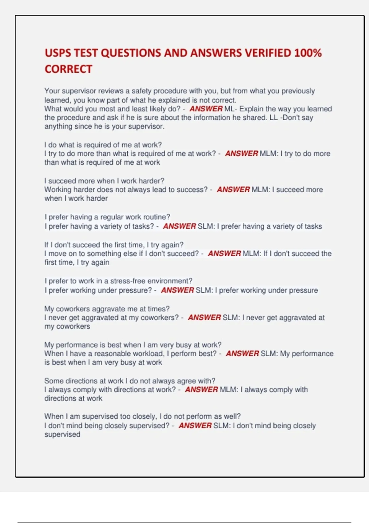 USPS TEST QUESTIONS AND ANSWERS VERIFIED 100% CORRECT Your supervisor reviews a safety procedure with you, but from what you previously learned, you know part of what he explained is not correct. What would you most and least likely do? - ANSWER ML- Explain the way you learned the procedure and ask if he is sure about the information he shared. LL -Don't say anything since he is your supervisor. I do what is required of me at work? I try to do more than what is required of me at work? - ANSWER MLM: I try to do more than what is required of me at work I succeed more when I work harder? Working harder does not always lead to success? - ANSWER MLM: I succeed more when I work harder I prefer having a regular work routine? I prefer having a variety of tasks? - ANSWER SLM: I prefer having a variety of tasks If I don't succeed the first time, I try again? I move on to something else if I don't succeed? - ANSWER MLM: If I don't succeed the first time, I try again I prefer to work in a stress-free environment? I prefer working under pressure? - ANSWER SLM: I prefer working under pressure My coworkers aggravate me at times? I never get aggravated at my coworkers? - ANSWER SLM: I never get aggravated at my coworkers My performance is best when I am very busy at work? When I have a reasonable workload, I perform best? - ANSWER SLM: My performance is best when I am very busy at work Some directions at work I do not always agree with? I always comply with directions at work? - ANSWER MLM: I always comply with directions at work When I am supervised too closely, I do not perform as well? I don't mind being closely supervised? - ANSWER SLM: I don't mind being closely supervised I can deal with anything that I am faced with? Some obstacles are too difficult to handle? - ANSWER MLM: I can deal with anything that I am faced with I always follow the rules, even when coworkers do not? Sometimes it is okay to make an exception to the rules? - ANSWER MLM: I always follow the rules, even when coworkers do not I'm a very focused individual? It is difficult for me to focus for long periods of time? - ANSWER MLM: I'm a very focused individual When plans change, I can adapt easily? I like to stick to the plan and complete it as intended? - ANSWER MLM: When plans change, I can adapt easily I prefer setting goals that are challenging and push my abilities? I like setting goals that I know are practical and reachable? - ANSWER MLM: I prefer setting goals that are challenging and push my abilities I prefer to not spend time double-checking my work? I always double check my work? - ANSWER SLM: I always double check my work When I spend a long time on a task, I get bored? I'm able to focus on the same task for a long time? - ANSWER MLM: I'm able to focus on the same task for a long time I enjoy when I have a lot of work to do? I prefer a reasonable and steady amount work? - ANSWER SLM: I enjoy when I have a lot of work to do At times it is okay to not tell the exact truth? It is best to be completely honest? - ANSWER MLM: It is best to be completely honest I always look over my work to make sure there are no errors? I'm not too worried about my work being perfect the first time? - ANSWER MLM: I always look over my work to make sure there are no errors At times, I have not liked someone? I haven't ever disliked someone? - ANSWER SLM: I haven't ever disliked someone I am confident in my ability to do well? I have doubted myself at times? - ANSWER MLM: I am confident in my ability to do well I'm able to work efficiently in highly demanding conditions? I would rather work in a peaceful environment? - ANSWER SLM: I'm able to work efficiently in highly demanding conditions The most important thing is accomplishing my goal? I am satisfied if I tried my best? - ANSWER SLM: I don't like when priorities regularly change? I adapt very well to change? - ANSWER MLM: I adapt very well to changer Sometimes I get sidetracked at work? I stay focused when I'm working? - ANSWER MLM: I stay focused when I'm working I always complete my work duties? I always exceed my responsibilities at work? - ANSWER SLM: I always exceed my responsibilities at work I do not mind my performance being closely supervised? I accomplish my work better when my supervisor doesn't closely observe? - ANSWER SLM: I do not mind my performance being closely supervised Most rewards are well deserved? Some people do not work hard enough to deserve a reward? - ANSWER MLM: Most rewards are well deserved I regularly take a lot of time to focus on one given task? I would rather work on various tasks than spend too much time on one? - ANSWER SLM: I would rather work on various tasks than spend too much time on one I enjoy working on various assignments? I rather work on repetitive tasks? - ANSWER SLM: I enjoy working on various assignments When I don't accomplish something, I keep trying? I move on to something else if I don't accomplish it? - ANSWER MLM: When I don't accomplish something, I keep trying I follow the rules the way I believe they are meant to be followed? I always follow the exact rules? - ANSWER MLM: I always follow the exact rules