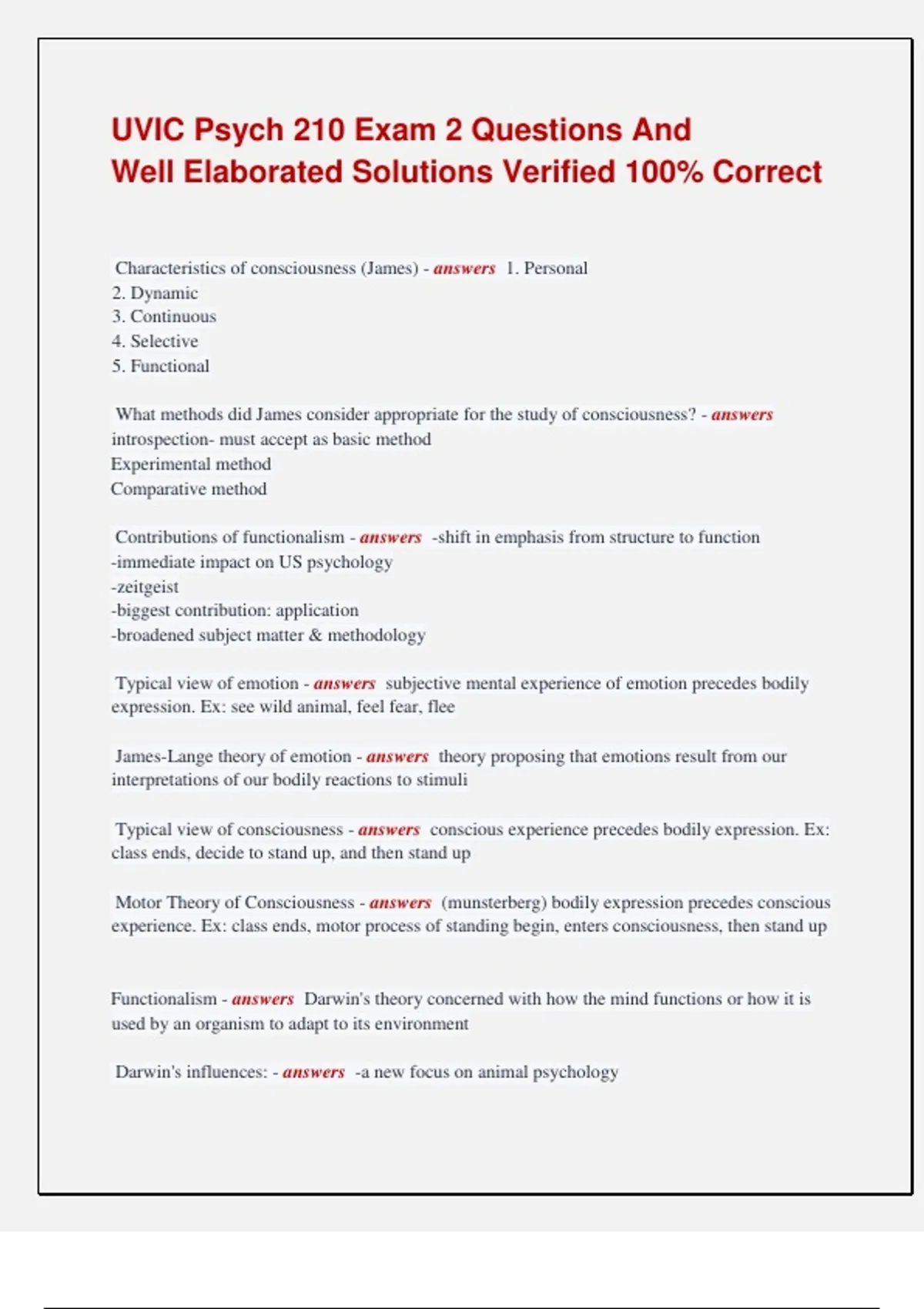 UVIC Psych 210 Exam 2 Questions And Well Elaborated Solutions Verified 100% Correct Characteristics of consciousness (James) - answers 1. Personal 2. Dynamic 3. Continuous 4. Selective 5. Functional What methods did James consider appropriate for the study of consciousness? - answers introspection- must accept as basic method Experimental method Comparative method Contributions of functionalism - answers -shift in emphasis from structure to function -immediate impact on US psychology -zeitgeist -biggest contribution: application -broadened subject matter & methodology Typical view of emotion - answers subjective mental experience of emotion precedes bodily expression. Ex: see wild animal, feel fear, flee James-Lange theory of emotion - answers theory proposing that emotions result from our interpretations of our bodily reactions to stimuli Typical view of consciousness - answers conscious experience precedes bodily expression. Ex: class ends, decide to stand up, and then stand up Motor Theory of Consciousness - answers (munsterberg) bodily expression precedes conscious experience. Ex: class ends, motor process of standing begin, enters consciousness, then stand up Functionalism - answers Darwin's theory concerned with how the mind functions or how it is used by an organism to adapt to its environment Darwin's influences: - answers -a new focus on animal psychology -a new emphasis on the functions rather than the structure of consciousness -acceptance of methodology and data from many fields -a new focus on the description and measurement of individual differences Mental test - answers tests of motor and sensory capacities; intelligence tests use more complex measures of mental abilities Anecdotal method - answers the use of observational reports about animal behavior Variability hypothesis - answers The notion that men show a wider range and variation of physical and mental development than women; the abilities of women are seen as more average. Women less likely to benefit from education Helen Bradford Thompson Woolley - answers found little to no sex difference in emotional functioning & intellectual abilities. Stressed social and environmental abilities Hollingworth - answers She provided scientific underpinnings for the feminist movement refuting some of the notions of male superiority. Refuted variability hypothesis, menstrual cycle unrelated to performance. Challenged inmate instinct for motherhood, stressed social and cultural attitudes Stream of consciousness - answers William James' idea that consciousness is a continuous flowing process and that any attempt to reduce it to elements will distort it Pragmatism - answers the doctrine that the validity of ideas is measured by their practical consequences Three-Part Self - answers material (everything we call our own), social (recognition we get from other people), spiritual (our inner or subjective being) Habit - answers James believed that all living creatures are "bundles of habits", repetitive or habitual actions, with repetition, required less conscious attention, have enormous social implications Mary calkins - answers -graduated by james -developed the paired-associate technique used in the study of memory -first women president of APA Granville Stanley Hall - answers first president of APA, first American doctoral degree in psych., voted smartest man, began 1st psychology lab in the US (johns hopkins) Recapitulation Theory - answers Hall's idea that the psychological development of children repeats the history of the human race Dewey - answers -published first American textbook of the new psychology Reflex arc - answers A relatively direct connection between a sensory neuron and a motor neuron that allows an extremely rapid response to a stimulus, often without conscious brain involvement. Dynamic Psychology - answers Robert Woodworth's system of psychology, which was concerned with the influence of causal factors and motivations on feelings and behavior. Mental tests - answers Tests of motor skills and sensory capacities; intelligence tests use more complex measures of mental abilities. Binet - answers developed first psychological test of mental ability Mental age - answers a measure of intelligence test performance devised by Binet; the chronological age that most typically corresponds to a given level of performance Intelligence quotient (IQ) - answers defined originally as the ratio of mental age (ma) to chronological age (ca) multiplied by 100 [thus, IQ = (ma/ca) x 100]. On contemporary intelligence tests, the average performance for a given age is assigned a score of 100. Otis - answers Army alpha/ armybeta, intelligence test for army recruits Scholastic Aptitude Test (SAT) - answers a test that measures the critical thinking mathematical, reasoning, and writing skills students need to do college-level work. Carl Brigham Bond - answers argued that IQ differences between races was due to environmental rather than inherited factors Women prohibited from - answers seeking university positions --> turned to employment in the applied fields Witmer - answers -began the field clinical psychology, what we now call school psychology the idea of freud was crucial to the advancement of clinical psychology, freud's ideas provided clinical psychologists with their initial psychological techniques of therapy