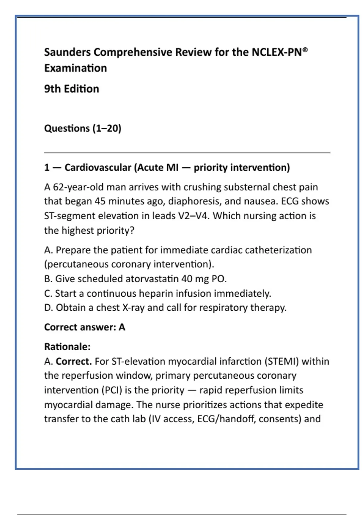 Saunders NCLEX-RN Comprehensive Medical-Surgical Test Bank | 250+ Original Practice Questions with Rationales | 2025 NCLEX Exam Prep Master NCLEX success with 250+ original Saunders-style Med-Surg questions. Includes rationales, pathophysiology, labs, & nursing priorities — NCLEX 2025 ready! Ace Your NCLEX-RN Exam with Confidence and Clarity — Powered by Saunders’ Proven Excellence Unlock your full nursing potential with this comprehensive NCLEX-RN Medical-Surgical Nursing Test Bank, built in the trusted style of Saunders Comprehensive Review for the NCLEX-RN Examination (Latest Edition). Featuring 250+ original, evidence-based NCLEX-style questions, this expertly curated resource covers every essential Med-Surg domain—cardiovascular, respiratory, neurological, gastrointestinal, renal, endocrine, and musculoskeletal disorders—with precision and depth. Each question is meticulously written by nurse educators and NCLEX item writers, aligned with the 2025 NCLEX-RN Test Plan to strengthen your clinical judgment, critical thinking, and prioritization skills. What’s Inside: 250+ Original NCLEX-RN Style Questions — written in the authentic Saunders tone and format. Detailed Rationales — for both correct and incorrect answers to deepen your understanding of why and how each option fits clinical reasoning. Core Focus Areas: Pathophysiology, Nursing Priorities, Laboratory Interpretation, Patient Education, and Safety Principles. Professional Formatting — ideal for educator test banks, student self-assessment, or group NCLEX review sessions. Fully Updated for the 2025 NCLEX-RN Test Plan — emphasizing Next Generation-style reasoning and evidence-based nursing care. Why Nursing Students & Educators Love It: Exam-Ready Confidence: Build the skills and mindset needed to master even the toughest NCLEX questions. Authentic Saunders Quality: Crafted with the clarity, clinical accuracy, and educational value you expect from the gold standard in NCLEX prep. Immediate Feedback: Rationales transform each question into a mini-lesson on pathophysiology, labs, and nursing judgment. Flexible Learning: Perfect for self-study, classroom integration, or virtual review sessions. Educator Approved: Organized in professional test-bank format—ready for quizzes, assignments, and NCLEX-style mock exams.