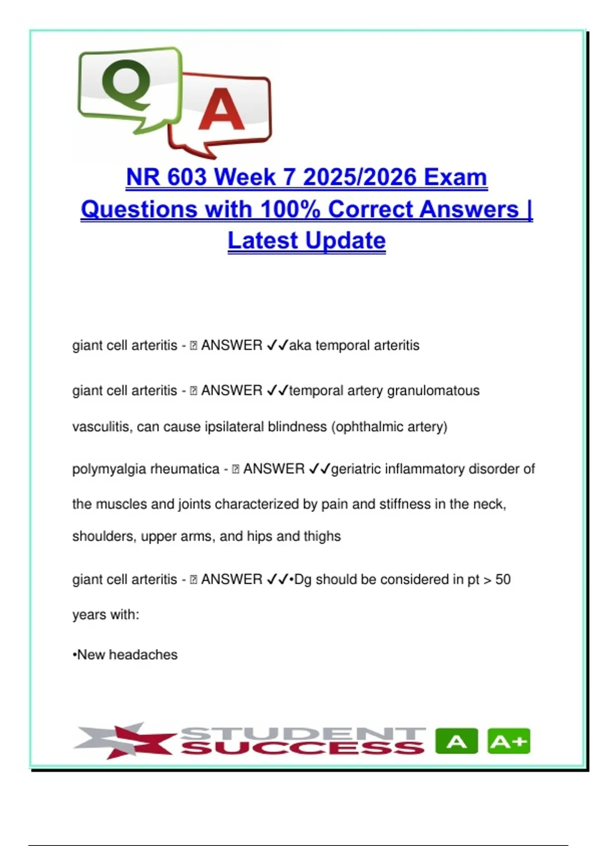 giant cell arteritis - 🧠 ANSWER ✔✔aka temporal arteritis