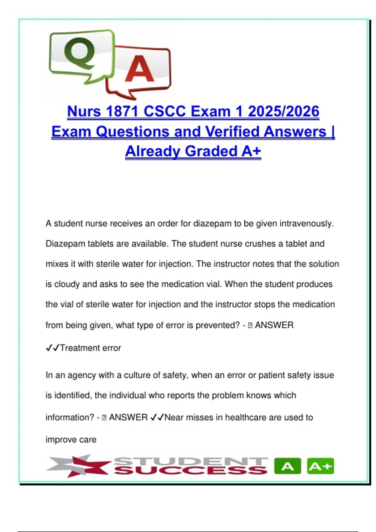 This professionally written document contains over 80 verified questions and answers for NURS 1871 – Exam 1 at Columbus State Community College (CSCC) for the 2025–2026 academic year. It provides comprehensive, exam-aligned content for students preparing for foundational nursing concepts involving patient safety, therapeutic communication, infection control, sensory perception, skin integrity, gas exchange, and perfusion. The safety section covers error types (treatment, latent, active), just culture, high-reliability organizations, and near-miss reporting, while the communication section explores therapeutic techniques, paralinguistic and metacommunication concepts, and professionalism in nursing. Legal and ethical considerations are included with focus on HIPAA, ANA mission, regulation, and advocacy. Students will also review sensory deficits, aging-related sensory decline, and nursing interventions such as alarms with visual and auditory components. The skin integrity section addresses pressure ulcers, burn depths, pruritus treatment, and sun protection strategies. In terms of perfusion and respiratory care, this guide includes key content on DVT prevention and management, COPD, chest tubes, oxygen therapy, ABG interpretation, and emergency interventions for acute respiratory distress. Additional content covers sleep disorders, functional assessment tools, ADLs/IADLs, cardiac rehabilitation, and early signs of myocardial infarction. This document is ideal for: – Nursing students in ADN, ASN, or BSN programs at CSCC or similar institutions – Courses focused on Nursing Fundamentals, Concept-Based Nursing, or Health Promotion – Learners preparing for NCLEX-RN, ATI, or HESI concept exams Clear, clinically relevant, and exam-tested, this document supports concept mastery and success on exams that assess both theory and applied nursing knowledge. Keywords: nursing safety, just culture, treatment error, therapeutic communication, paralinguistic cues, metacommunication, sensory deficit care, pressure ulcers, wound healing, pruritus, melanoma prevention, COPD care, oxygen delivery, chest tube management, ABG interpretation, DVT prevention, perfusion assessment, myocardial infarction signs, functional ability, ADLs, IADLs