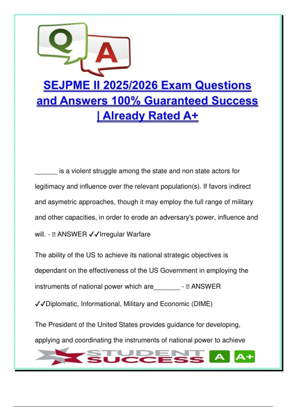 This advanced-level exam guide provides over 200 expertly answered questions for the Senior Enlisted Joint Professional Military Education (SEJPME) II program for the 2025–2026 academic cycle. Tailored for senior enlisted leaders in joint military environments, the document offers deep insight into joint operations, command structures, national strategy, and operational planning—perfect for final exam preparation or promotion boards. Topics include extensive coverage of irregular warfare, joint force command, National Military and Security Strategies, DIME framework (Diplomatic, Informational, Military, Economic), and combatant command authority structures. Learners will master distinctions between operational vs. tactical command, roles of JTF, CJCS, NSC, and the coordination between DoD, intelligence, and interagency partners. A full section on intelligence operations explains priority intelligence requirements, collection management, J2 functions, and dissemination strategies. It also addresses the impact of information overload, national strategic vs. operational intelligence, and technical risks of social media in modern warfare. You’ll also find rich content on mission command principles, including disciplined initiative, delegation of authority, and ethical dilemmas in dynamic operational environments. Additional modules address psychological health, traumatic brain injury, resilience building, and joint logistics functions such as supply chains, personnel services, and redeployment planning. This document is structured in a Q&A flashcard format, with each concept accompanied by direct, correct answers designed for rapid review and knowledge retention. Best suited for: – Senior enlisted military personnel (E-7 to E-9) – Candidates enrolled in SEJPME II or Joint PME courses – Members preparing for joint command positions, promotion exams, or military strategy certification – All branches of the U.S. Armed Forces, including Active Duty, Reserve, and National Guard components This is a mission-critical asset for understanding the structure, doctrine, and execution of joint military operations in today's global environment. Keywords: SEJPME II exam, joint operations, irregular warfare, national security strategy, DIME framework, CJCS, combatant command, JTF, operational command, mission command, intelligence cycle, J2 functions, resilience, PTSD, TBI, psychological fitness, Total Force Fitness, joint logistics, redeployment, NSC, military strategy, interagency coordination, military leadership