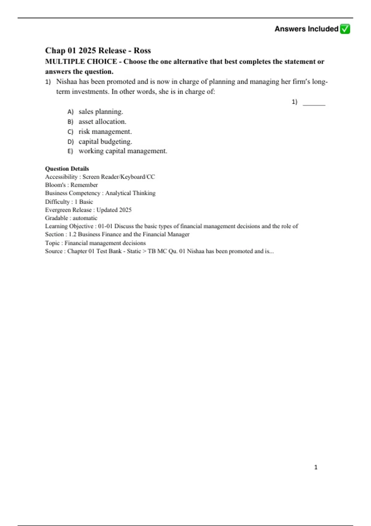 Complete Test Bank for Essentials of Corporate Finance, 2025 Evergreen Release 11e 11th Edition by Stephen Ross, Randolph Westerfield and Bradford Jordan. All Chapters (Ch 1 to 18) are included with answers. PART ONE: OVERVIEW OF FINANCIAL MANAGEMENT Chapter 1: Introduction to Financial Management PART TWO: UNDERSTANDING FINANCIAL STATEMENTS AND CASH FLOW Chapter 2: Financial Statements, Taxes, and Cash Flow Chapter 3: Working with Financial Statements PART THREE: VALUATION OF FUTURE CASH FLOWS Chapter 4: Introduction to Valuation: The Time Value of Money Chapter 5: Discounted Cash Flow Valuation PART FOUR: VALUING STOCKS AND BONDS Chapter 6: Interest Rates and Bond Valuation Chapter 7: Equity Markets and Stock Valuation PART FIVE: CAPITAL BUDGETING Chapter 8: Net Present Value and Other Investment Criteria Chapter 9: Making Capital Investment Decisions PART SIX: RISK AND RETURN Chapter 10: Some Lessons from Capital Market History Chapter 11: Risk and Return PART SEVEN: LONG-TERM FINANCING Chapter 12: Cost of Capital Chapter 13: Leverage and Capital Structure Chapter 14: Dividends and Dividend Policy Chapter 15: Raising Capital PART EIGHT: SHORT-TERM FINANCIAL MANAGEMENT Chapter 16: Short-Term Financial Planning Chapter 17: Working Capital Management PART NINE: TOPICS IN BUSINESS FINANCE Chapter 18: International Aspects of Financial Management