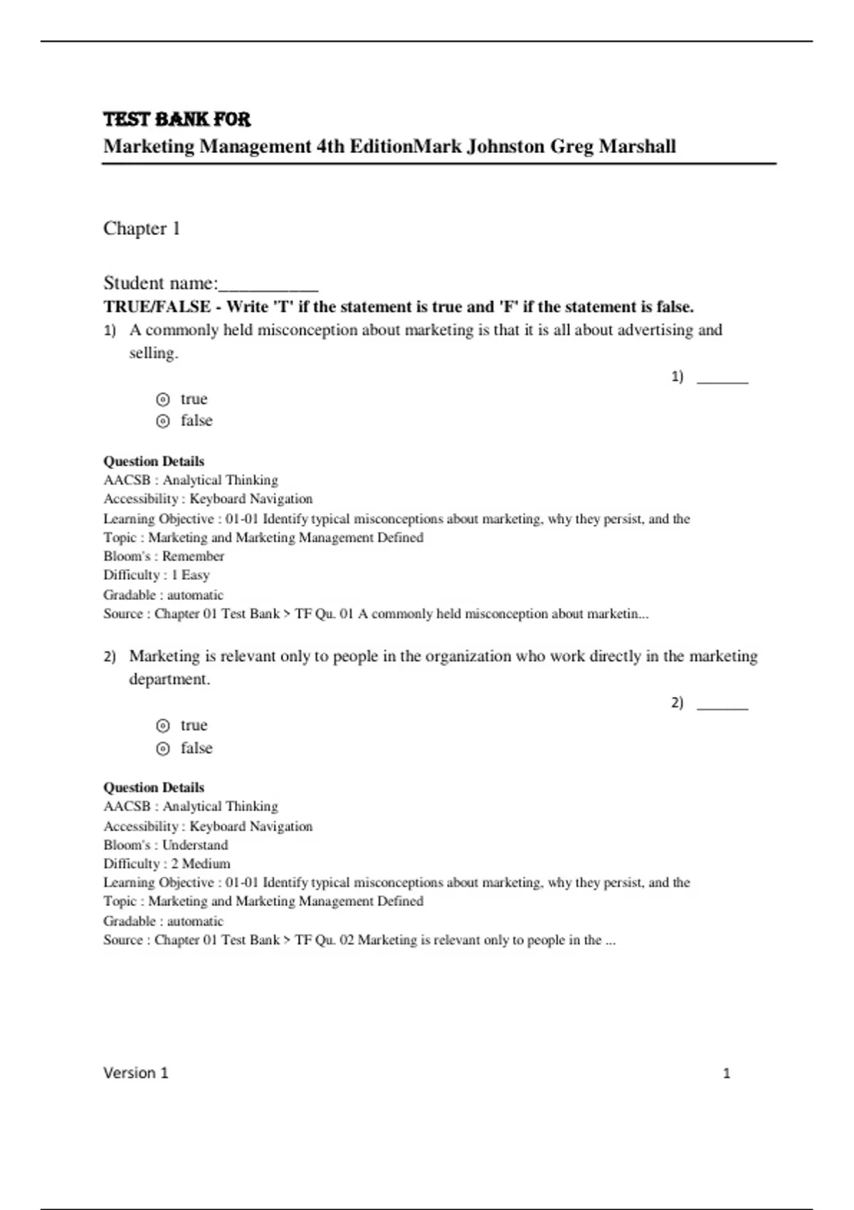 This document provides the complete Test Bank for Marketing Management (4th Edition) by Mark W. Johnston and Greg W. Marshall. It contains multiple-choice, true/false, and short-answer questions with verified answers and rationales for all chapters. Key topics include marketing concepts and strategy, customer value, the evolution of marketing, market orientation, and marketing metrics. Designed for instructors and students, this test bank supports exam preparation, quiz creation, and mastery of core marketing principles.