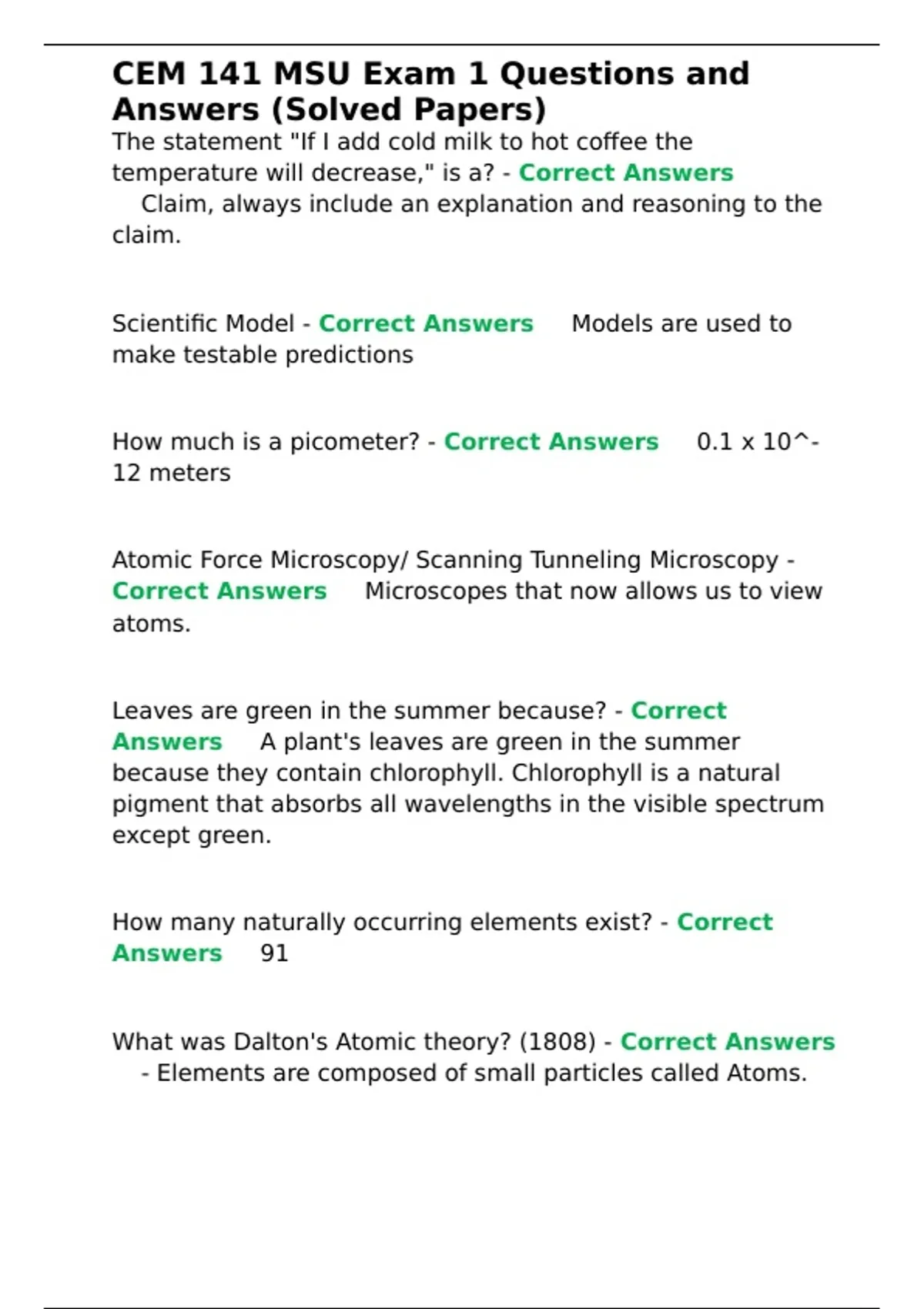 CEM 141 MSU Exam 1 Questions and