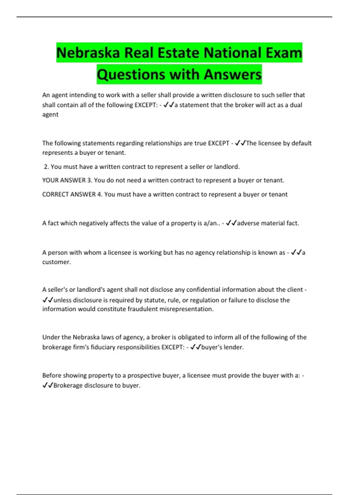 Nebraska law requires a seller's agent to - ✔✔disclose all known material facts about the