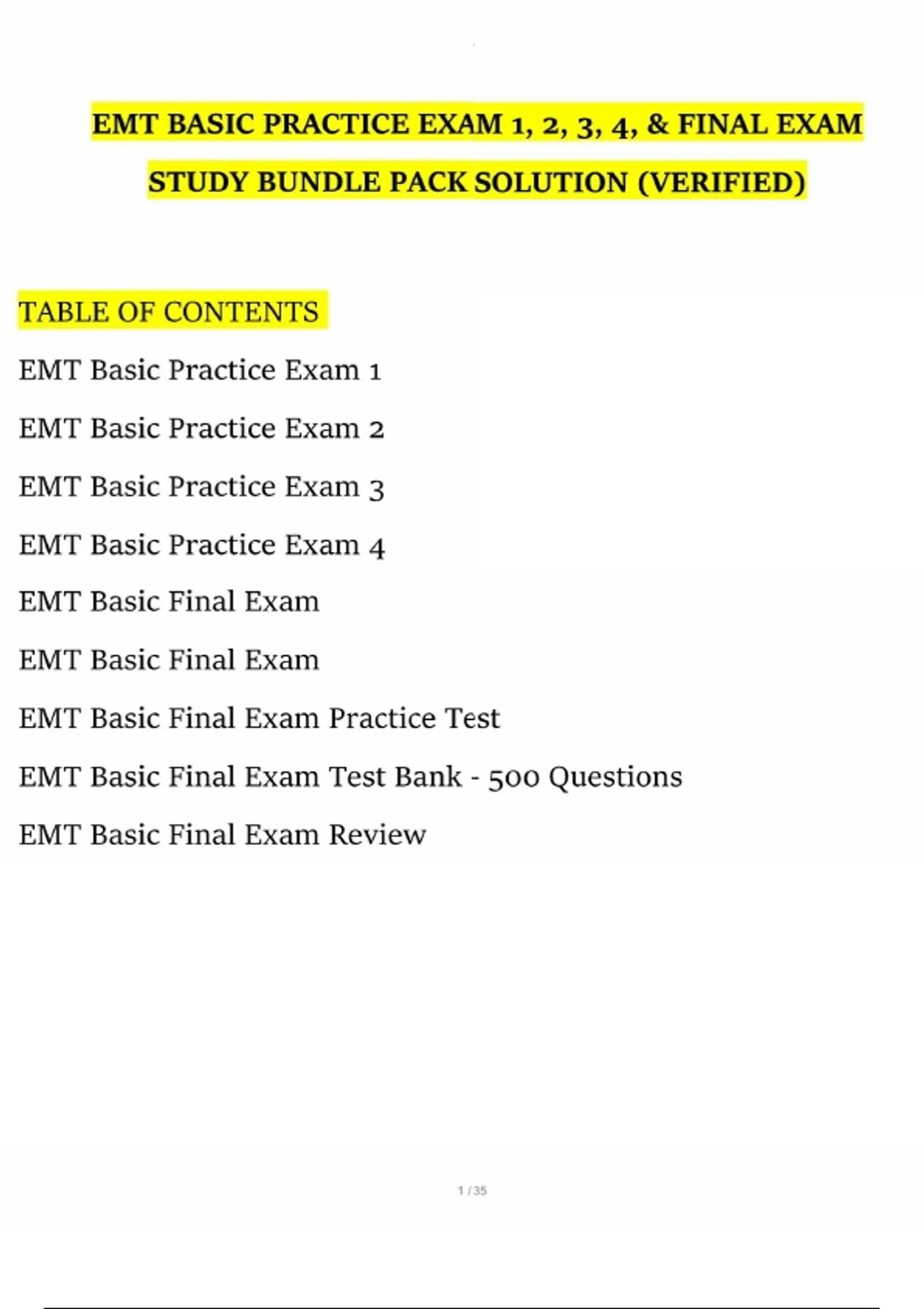 Complete 2025–2026 EMT Basic Practice Exam Bundle featuring Exams 1–4 and the Final Exam with 100% verified questions and answers. Covers trauma, airway management, CPR, medical emergencies, patient assessment, obstetrics, and EMS operations. Perfect for EMT students preparing for NREMT and state certification. Includes rationales, real test-style questions, and updated emergency care guidelines to guarantee top scores.