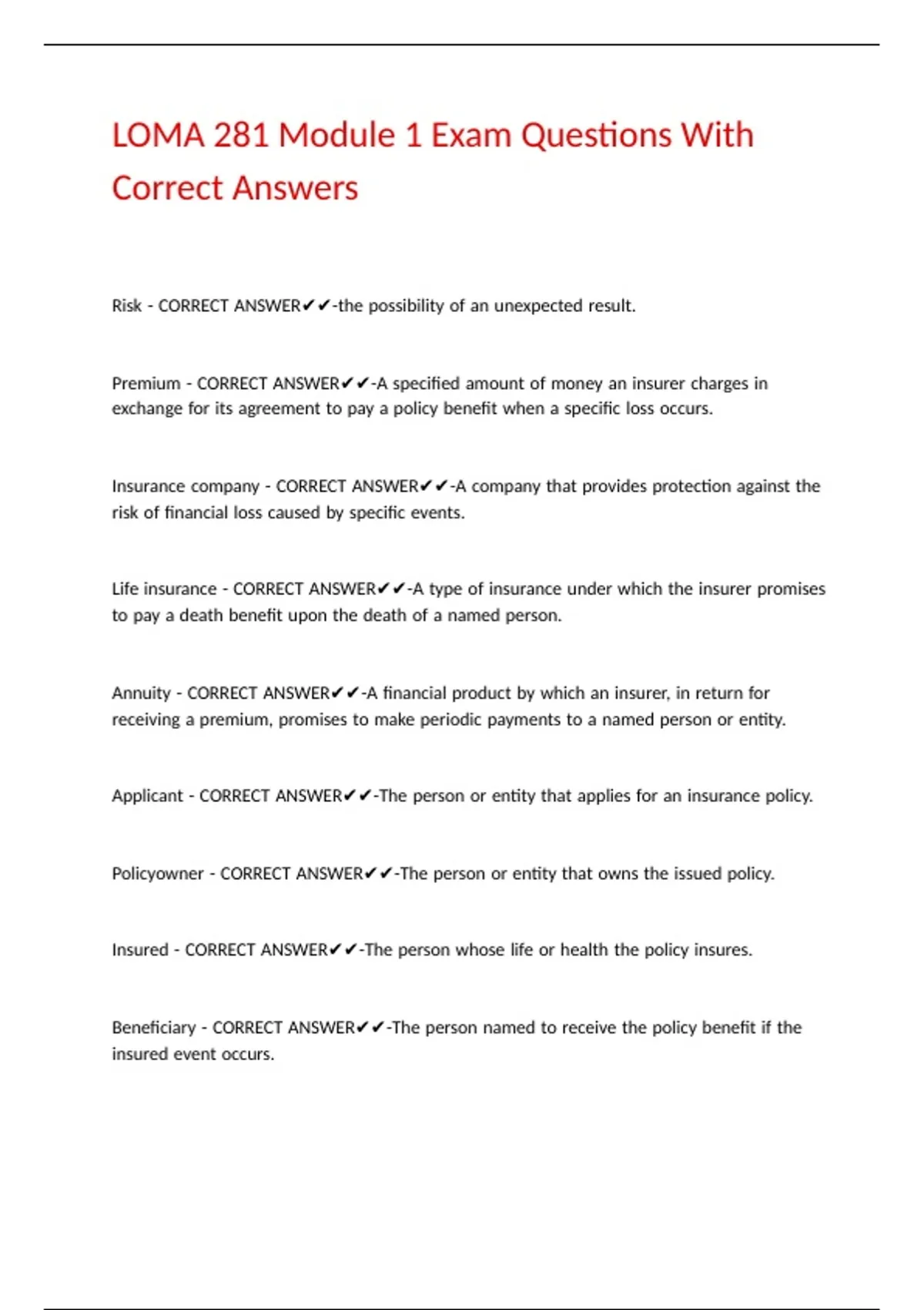 LOMA 281 Module 1 Exam Questions With Correct Answers.
