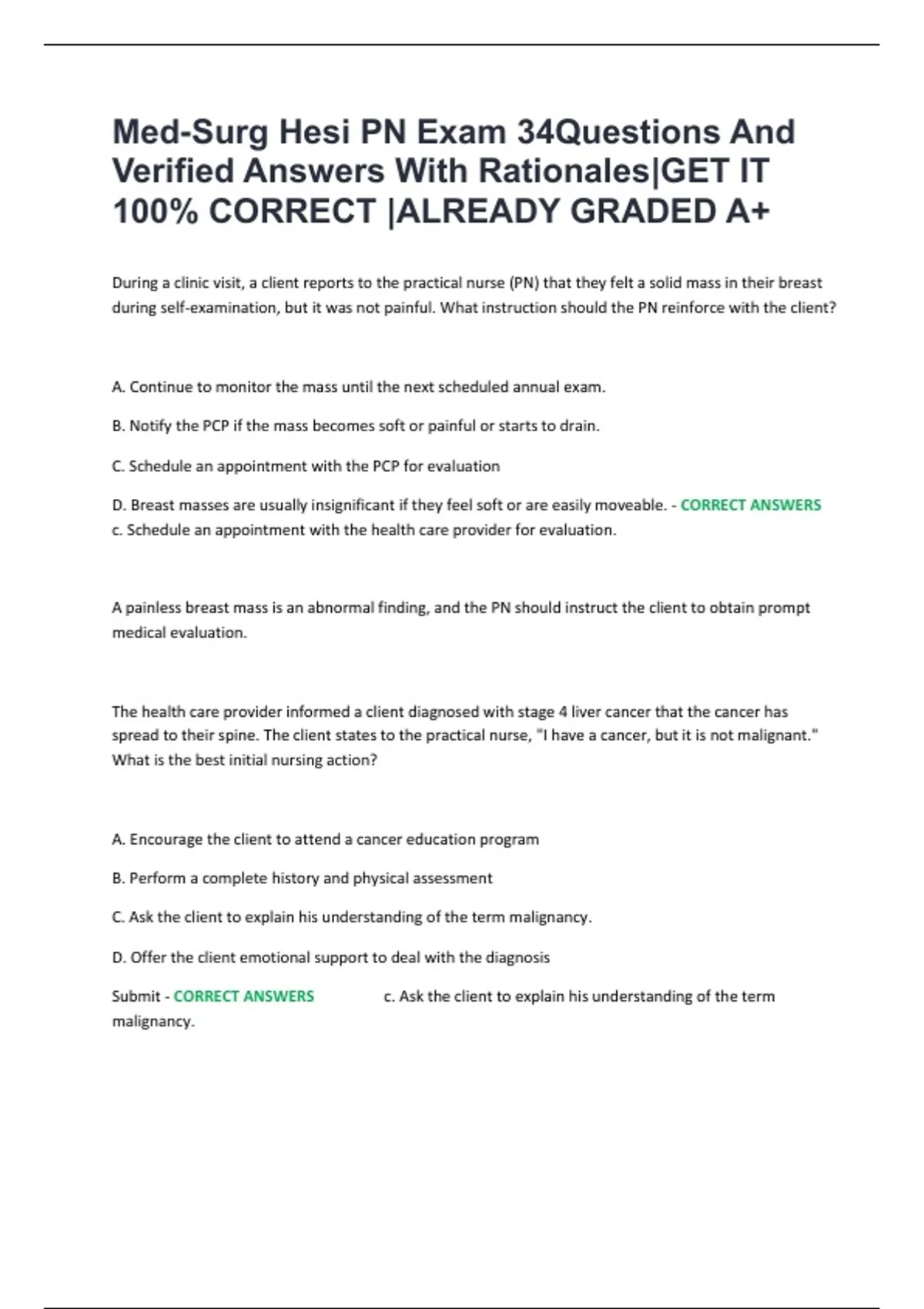 Summary Med-Surg Hesi PN Exam 34Questions And Verified Answers With Rationales|GET IT 100% CORRECT |ALREADY GRADED A+