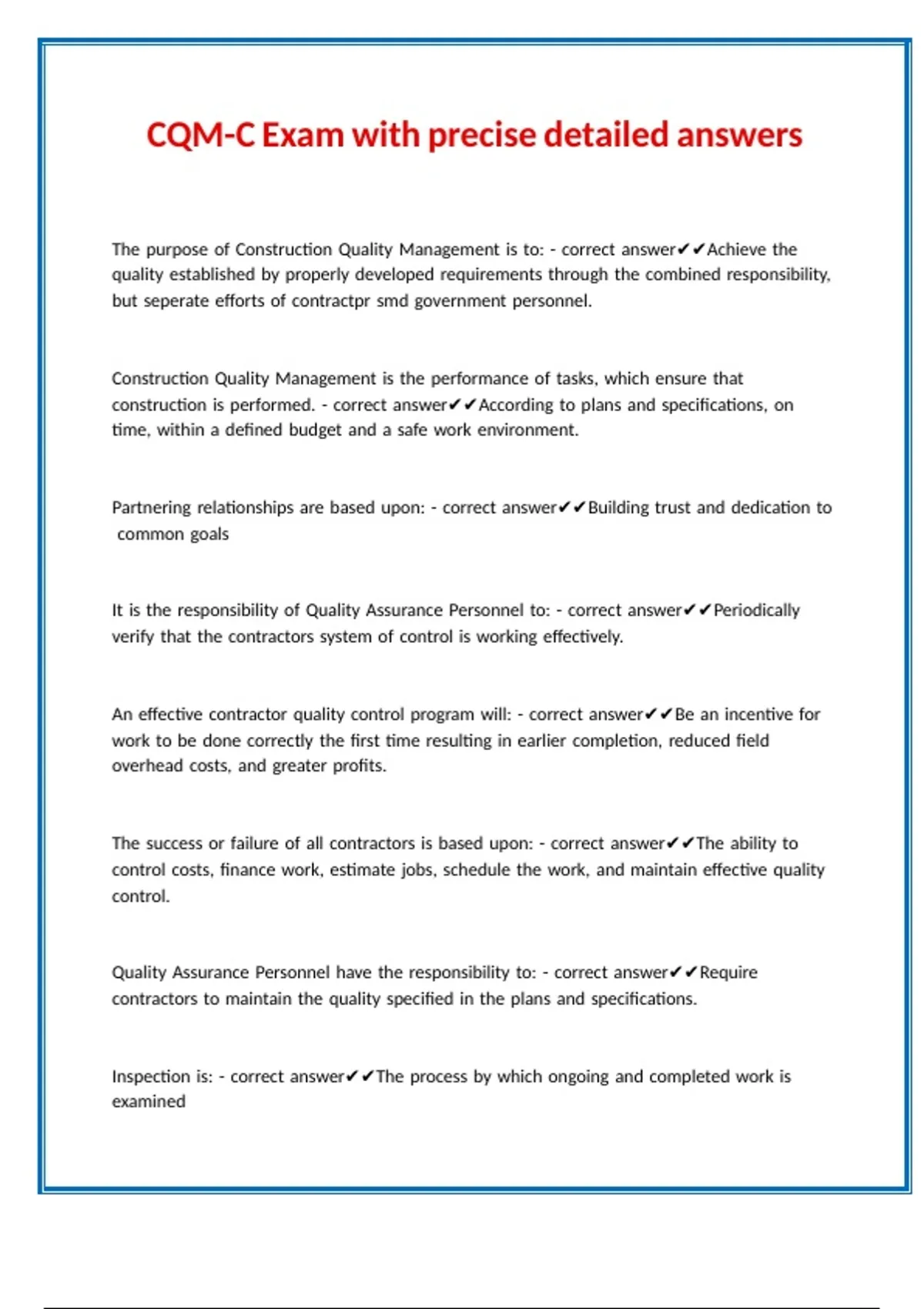 The purpose of Construction Quality Management is to: - correct answer✔✔Achieve the