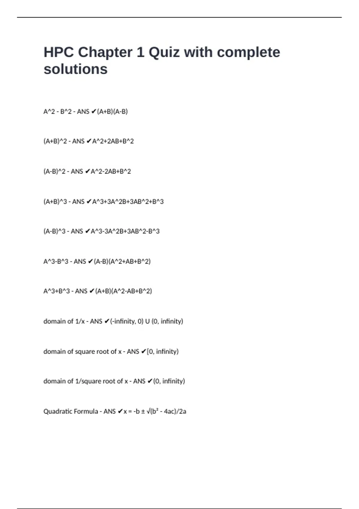 Quadratic Formula - ANS ✔x = -b ± √(b² - 4ac)/2a