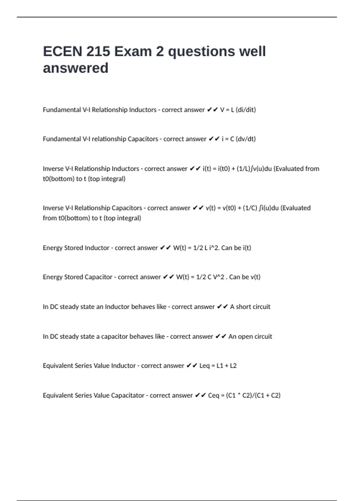 Equivalent Series Value Capacitator - correct answer ✔✔ Ceq = (C1 * C2)/(C1 + C2)