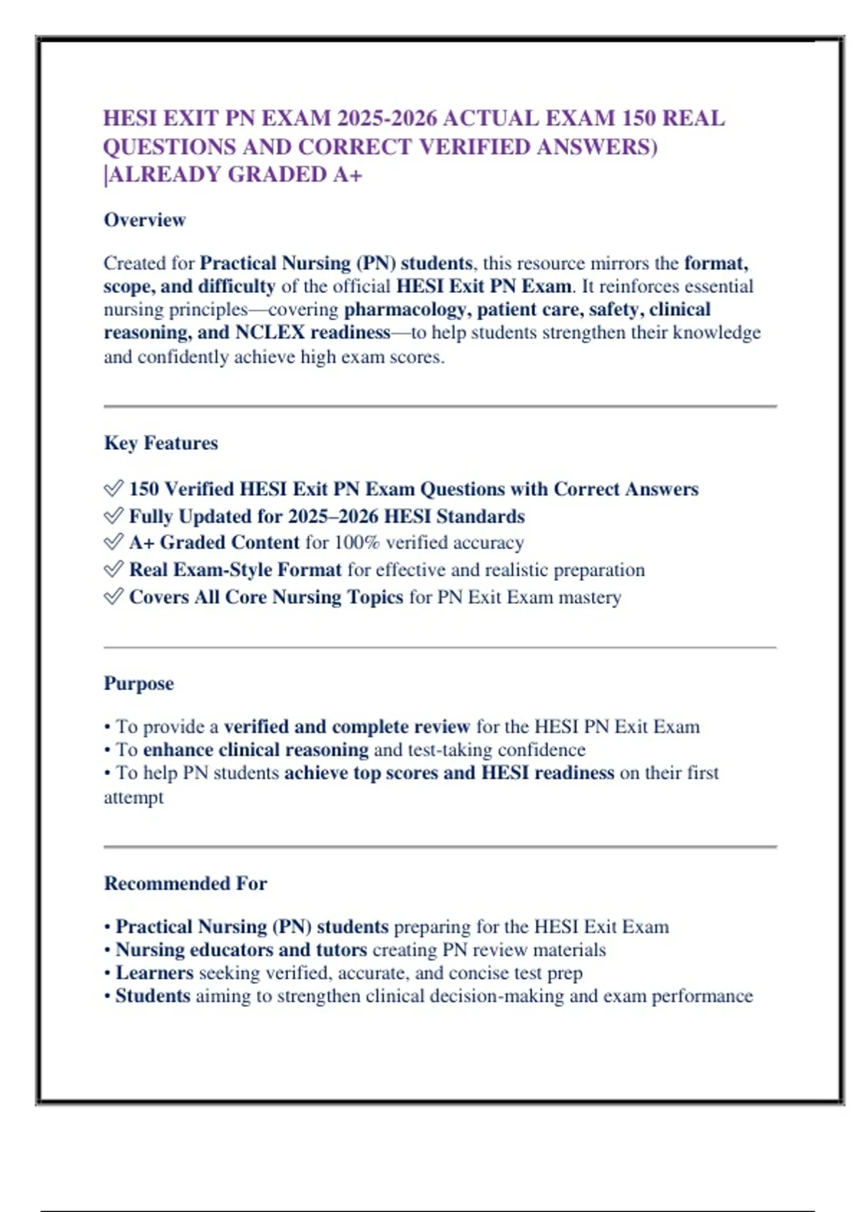 ✅ 150 Verified HESI Exit PN Exam Questions with Correct Answers