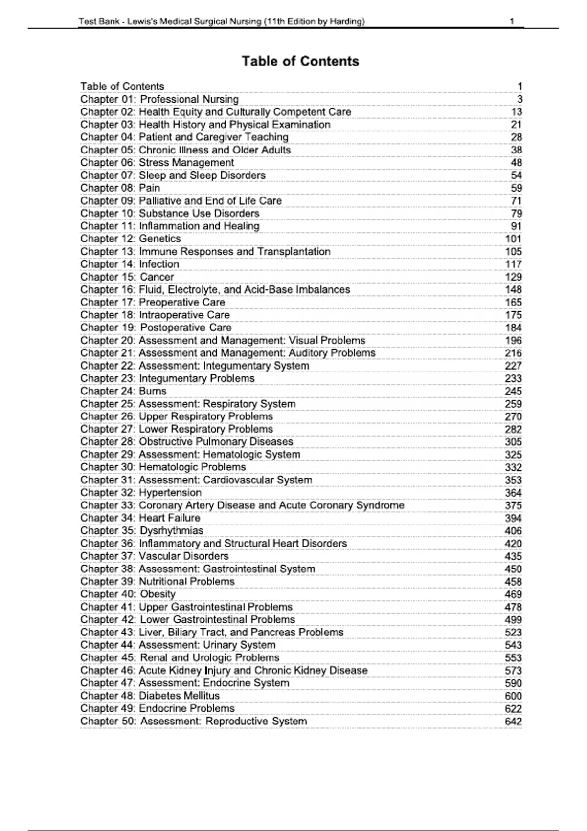 This document contains the complete official test bank for Lewis’s Medical-Surgical Nursing: Assessment and Management of Clinical Problems, 11th Edition by Sharon L. Lewis, Linda Bucher, Mariann M. Harding, and colleagues. It includes all chapters with multiple-choice, true/false, and alternate-format questions, each provided with correct answers, rationales, difficulty levels, and learning outcomes. Fully aligned with the 11th Edition textbook, this resource covers every major topic in adult health and medical-surgical nursing — ideal for nursing students preparing for ATI, HESI, and NCLEX-RN exams or instructors building classroom tests.This comprehensive test bank includes thousands of NCLEX-style practice questions reflecting the latest nursing standards and clinical guidelines. It’s perfect for exam preparation, lecture support, and skills reinforcement across all areas of medical-surgical nursing