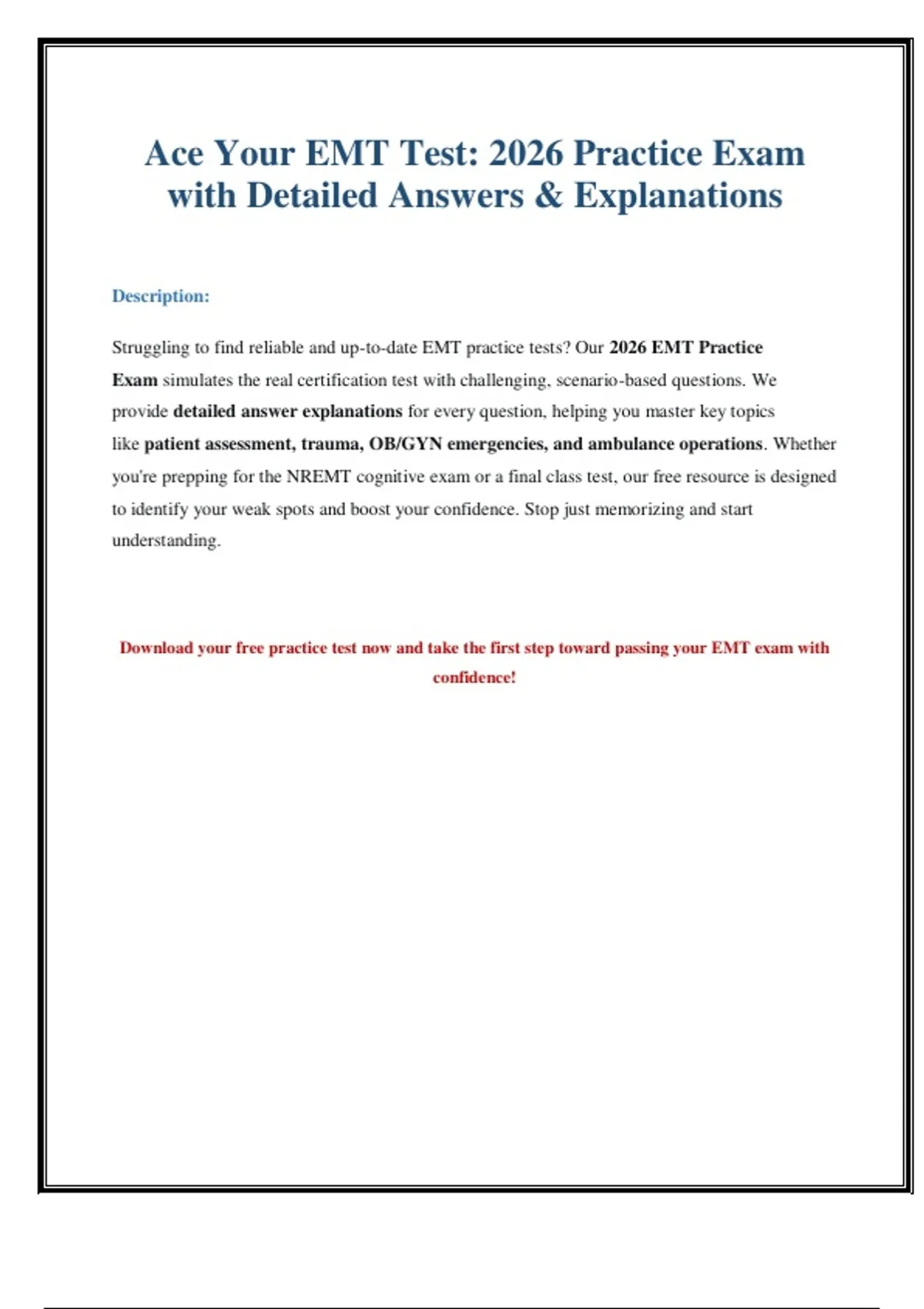 Struggling to find reliable and up-to-date EMT practice tests? Our 2026 EMT Practice Exam simulates the real certification test with challenging, scenario-based questions. We provide detailed answer explanations for every question, helping you master key topics like patient assessment, trauma, OB/GYN emergencies, and ambulance operations. Whether you're prepping for the NREMT cognitive exam or a final class test, our free resource is designed to identify your weak spots and boost your confidence. Stop just memorizing and start understanding.