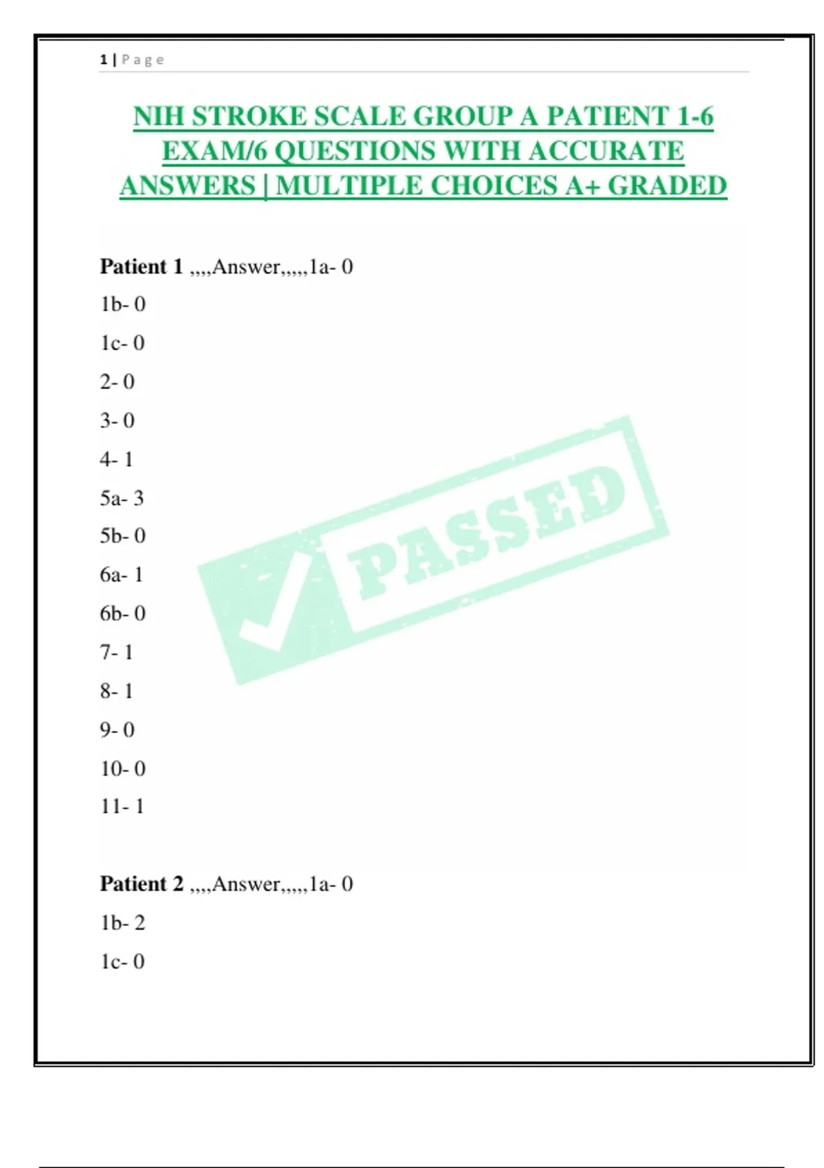 This NIH Stroke Scale (NIHSS) Group A – Patient 1–6 Exam Guide includes 6 multiple-choice questions with verified A+ graded answers, developed to help nursing and medical students master the official NIH Stroke Scale assessment. Each question reflects real exam-style clinical scenarios, testing accurate scoring, neurological function evaluation, and patient response interpretation. It’s fully updated for 2025/2026 and based on current NIHSS certification standards, ensuring accuracy and readiness for both academic exams and clinical practice tests. Ideal for nursing students, emergency care trainees, and healthcare professionals seeking to strengthen their stroke assessment skills and achieve certification success.