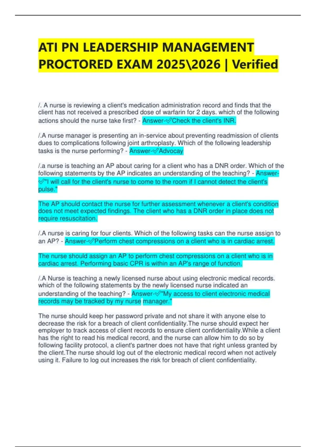 ATI PN LEADERSHIP MANAGEMENT PROCTORED EXAM | Verified /. A nurse is reviewing a client's medication administration record and finds that the client has not received a prescribed dose of warfarin for 2 days. which of the following actions should the nurse take first? - Answer-Check the client's INR. /.A nurse manager is presenting an in-service about preventing readmission of clients dues to complications following joint arthroplasty. Which of the following leadership tasks is the nurse performing? - Answer-Advocay /.a nurse is teaching an AP about caring for a client who has a DNR order. Which of the following statements by the AP indicates an understanding of the teaching? - Answer-"I will call for the client's nurse to come to the room if I cannot detect the client's pulse." The AP should contact the nurse for further assessment whenever a client's condition does not meet expected findings. The client who has a DNR order in place does not require resuscitation. /.A nurse is caring for four clients. Which of the following tasks can the nurse assign to an AP? - Answer-Perform chest compressions on a client who is in cardiac arrest. The nurse should assign an AP to perform chest compressions on a client who is in cardiac arrest. Performing basic CPR is within an AP's range of function. /.A Nurse is teaching a newly licensed nurse about using electronic medical records. which of the following statements by the newly licensed nurse indicated an understanding of the teaching? - Answer-"My access to client electronic medical records may be tracked by my nurse manager." The nurse should keep her password private and not share it with anyone else to decrease the risk for a breach of client confidentiality.The nurse should expect her employer to track access of client records to ensure client confidentiality.While a client has the right to read his medical record, and the nurse can allow him to do so by following facility protocol, a client's partner does not have that right unless granted by the client.The nurse should log out of the electronic medical record when not actively using it. Failure to log out increases the risk for breach of client confidentiality. /.a nurse is receiving change-of-shift report. which of the following clients should the nurse assess first? - Answer-A client who had abdominal surgery 6 hours ago and had a heart rate of 120/min for the last 2 hours. /.A RN delegates the task of obtaining the bp of a client who is 2hr post-op following a cholecystectomy to a LPN. The LPN reports a BP that is significantly higher than the clients previous reading. which of the following actions should the RN take first? - Answer-Recheck client's BP /.A public health nurse is developing a list of recommendations for her supervisior on how to use EBP to improve community outcomes. Which of the following should the nurse recommend as a qualitative research method? - Answer-Phenomenology Meta-analysis is a quantitative research method that provides a statistical analysis of multiple studies conducted on the same topic.Experimental study is a quantitative research method that uses control and treatment groups to test at least one independent variable.Phenomenology is a qualitative research method that provides additional understanding of participants' experiences with emotional variances, such as grief and hope.Secondary analysis is a quantitative research method that uses previously collected data to answer newly formed hypotheses. /.A nurse at a urgent care clinic notices that a pain assessment is not being performed for all clients as required by policy. Which of the following actions should the nurse take to ensure care is provided according to policy? - Answer-Report this issue to the nurse manager. The nurse should report this issue to the nurse manager because it is the manager's responsibility to ensure that standards are met and that care is provided according to policy. /.A nurse is teaching a client about advance directives. Which of the following statements by the client indicates an understanding of the teaching? - Answer-"These will outline my wishes for medication treatment." The purpose of advance directives is to outline the client's wishes if they become unresponsive /.A nurse is caring for a client who recently learned he has a mutation of the BRCA2 gene. The client states that he does not plan to tell his adult children about the dx. Which of the following responses displays clients advocacy by the nurse? - Answer-"Let's review what you understand about this test result." The nurse should use therapeutic communication techniques to encourage the client to share his point of view and to convey respect for the client's decisions. By seeking to understand the client's perceptions in a nonjudgmental manner, the nurse is displaying client advocacy.