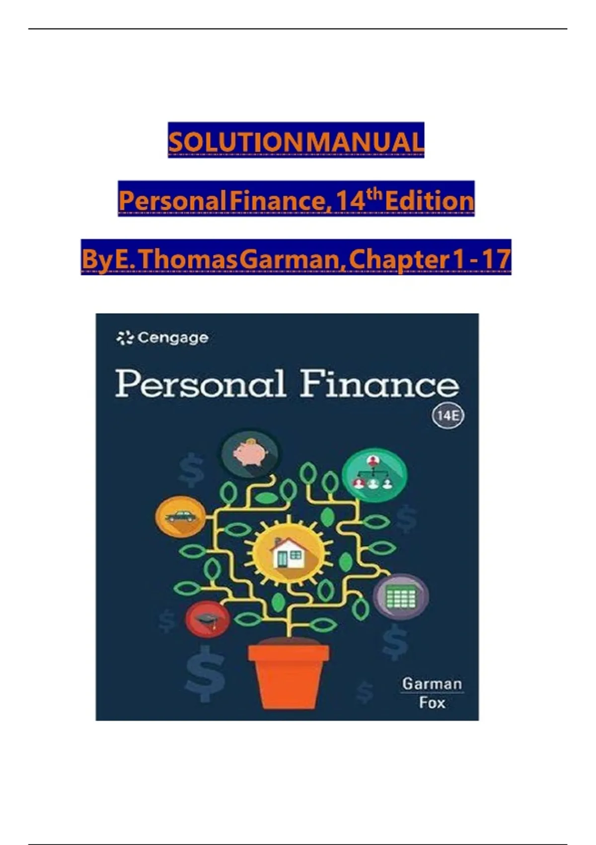 This is the complete Solution Manual for the 14th Edition of Personal Finance by E. Thomas Garman and Jack Fox. The manual contains verified solutions and answers for all 17 chapters and is an essential resource for students and educators in personal finance courses. The content is organized around four core areas of financial management: Part I: Financial Planning, which covers career planning, financial statements, goals, and budgets; Part II: Money Management, addressing income taxes, banking, credit, loans, and housing; Part III: Income and Asset Protection, which includes managing property/liability risk, health care, and life insurance planning ; and Part IV: Investments, which details fundamentals, investing in stocks and bonds, mutual and exchange-traded funds, and Retirement and Estate Planning.