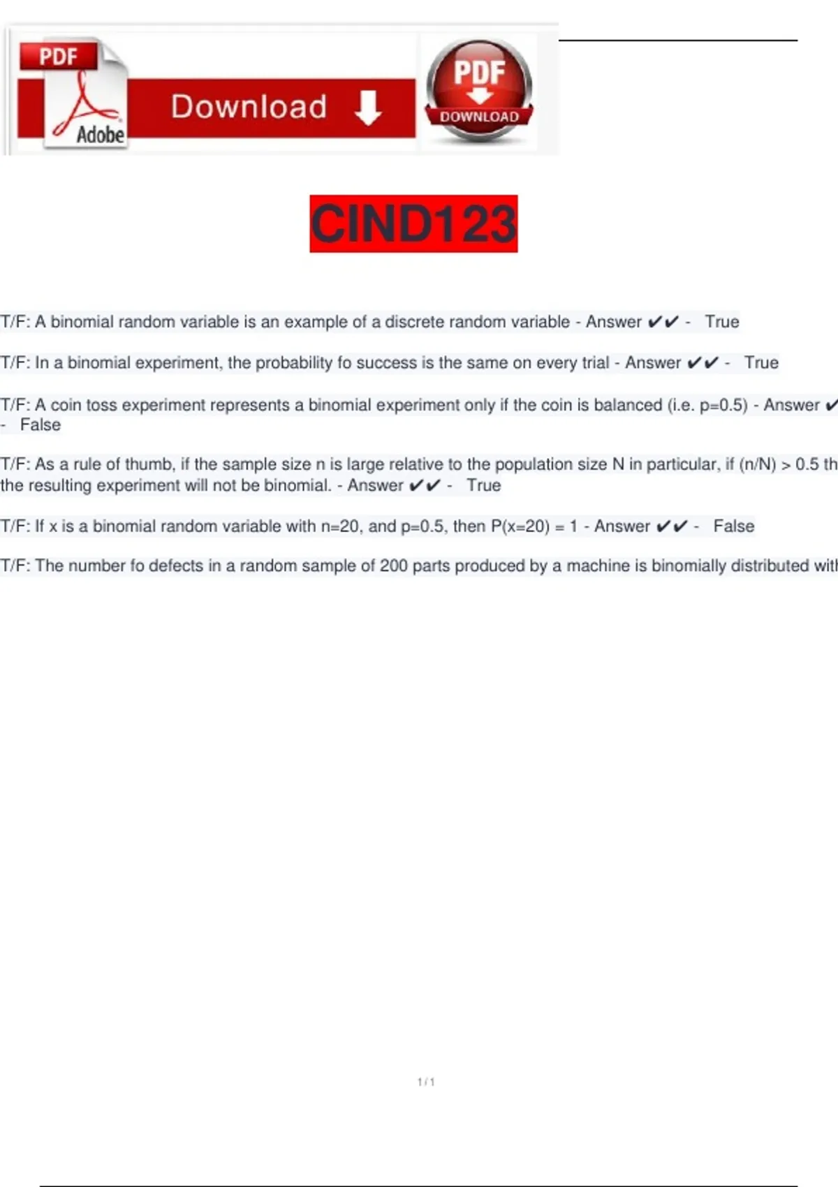 T/F: If x is a binomial random variable with n=20, and p=0.5, then P(x=20) = 1 - Answer ✔✔ - False