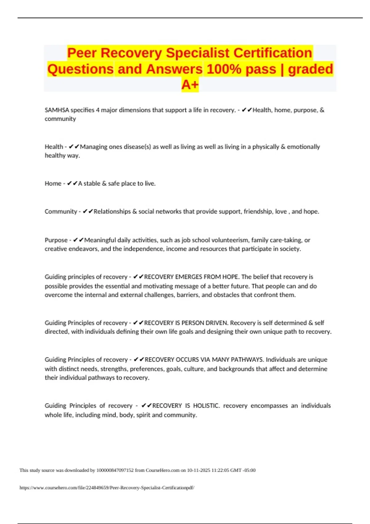 This document provides a comprehensive overview of the Peer Recovery Specialist Certification exam materials. It includes key concepts, practice questions, and detailed explanations covering the principles of peer support, recovery-oriented care, ethics and boundaries, communication techniques, cultural competence, and crisis intervention. Perfect for individuals preparing for certification as a Peer Recovery Specialist, ensuring full understanding of exam content and real-world application.
