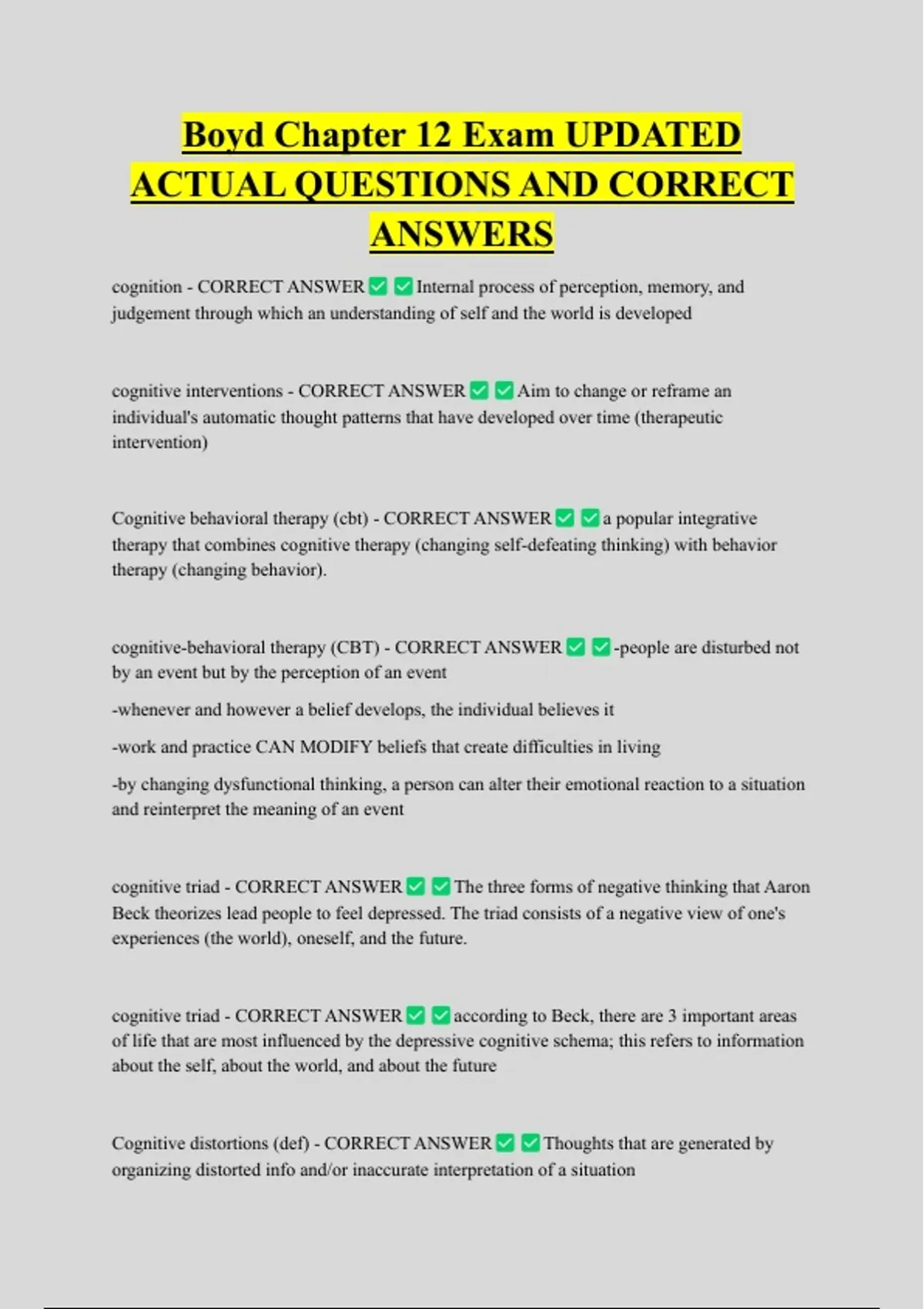 Boyd Chapter 12 Exam UPDATED ACTUAL QUESTIONS AND CORRECT ANSWERS cognition - CORRECT ANSWER Internal process of perception, memory, and judgement through which an understanding of self and the world is developed cognitive interventions - CORRECT ANSWER Aim to change or reframe an individual's automatic thought patterns that have developed over time (therapeutic intervention) Cognitive behavioral therapy (cbt) - CORRECT ANSWER a popular integrative therapy that combines cognitive therapy (changing self-defeating thinking) with behavior therapy (changing behavior). cognitive-behavioral therapy (CBT) - CORRECT ANSWER by an event but by the perception of an event -people are disturbed not -whenever and however a belief develops, the individual believes it -work and practice CAN MODIFY beliefs that create difficulties in living -by changing dysfunctional thinking, a person can alter their emotional reaction to a situation and reinterpret the meaning of an event